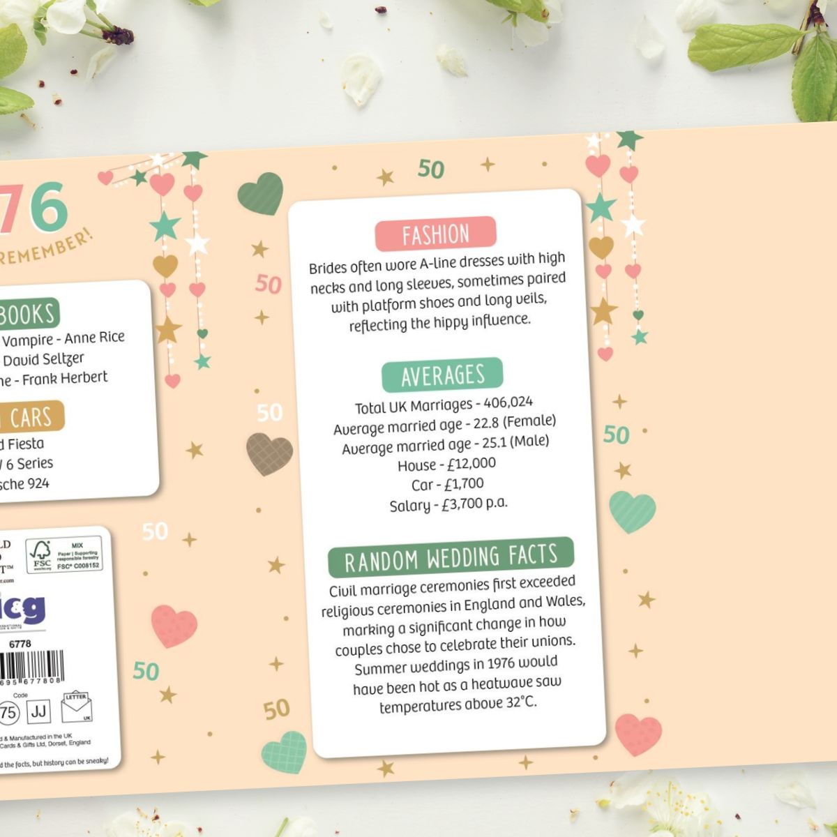 Stunning full colour 3-fold, embossed Golden Wedding Anniversary card with gold foil details. Colour printed inside with fun facts about 1976.