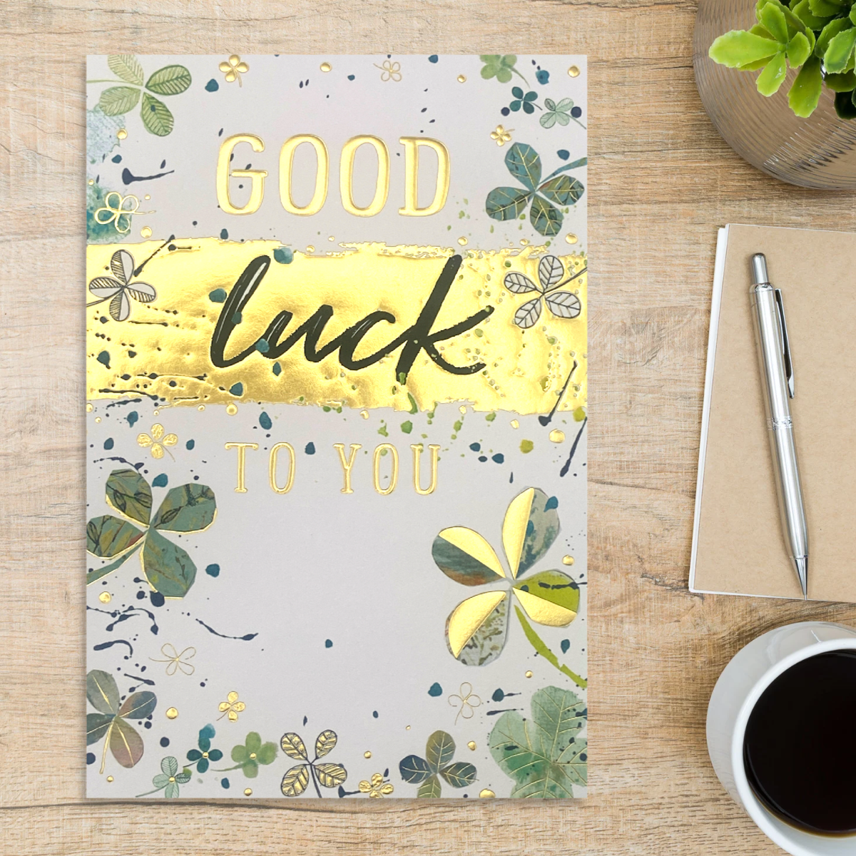 Fantastic Good Luck card with beautiful gold foiling detail and colour printed inside.