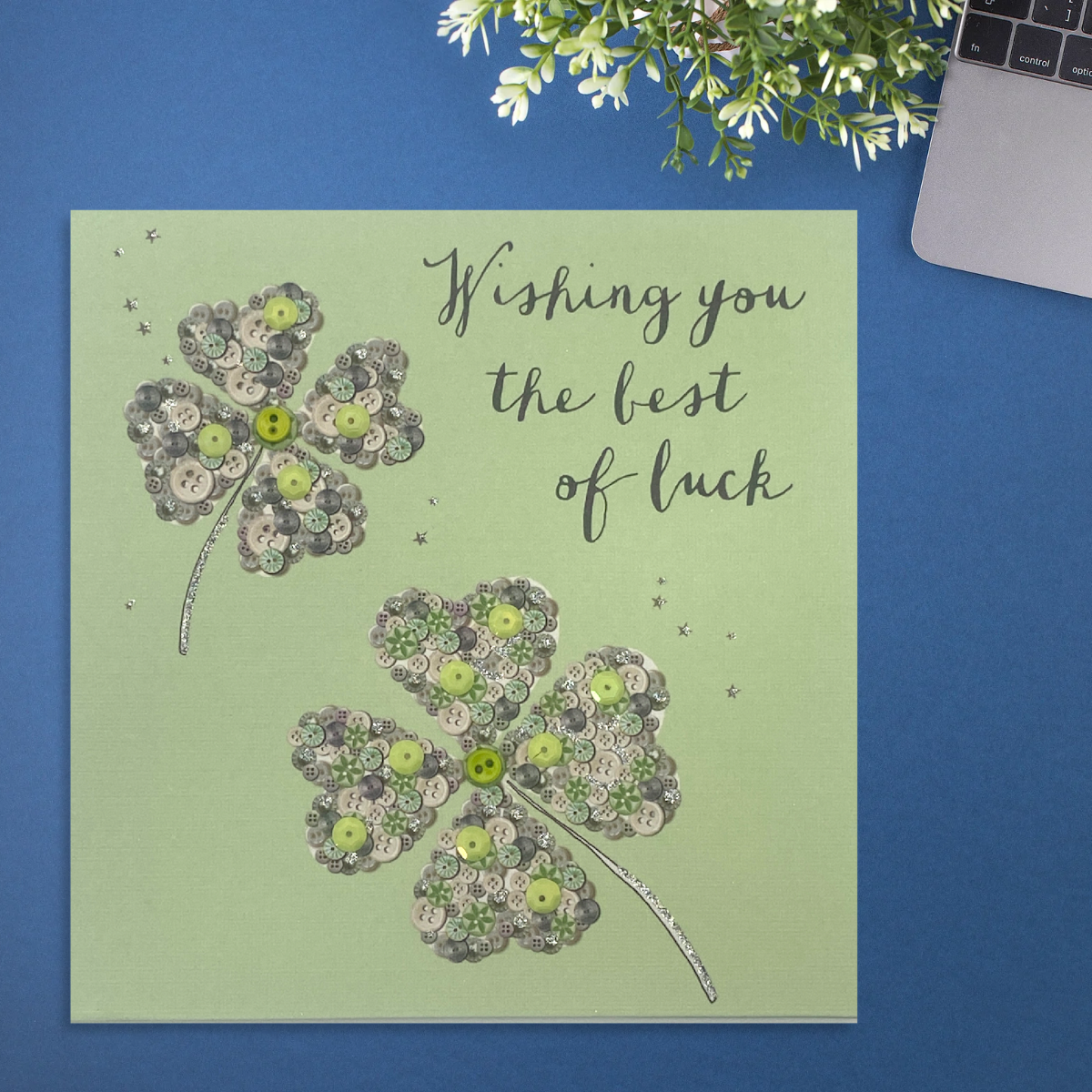 Fabulous textured Good Luck card from the Buttoned Up collection with small green button embellishments and added sparkle. Finished with silver coloured envelope.