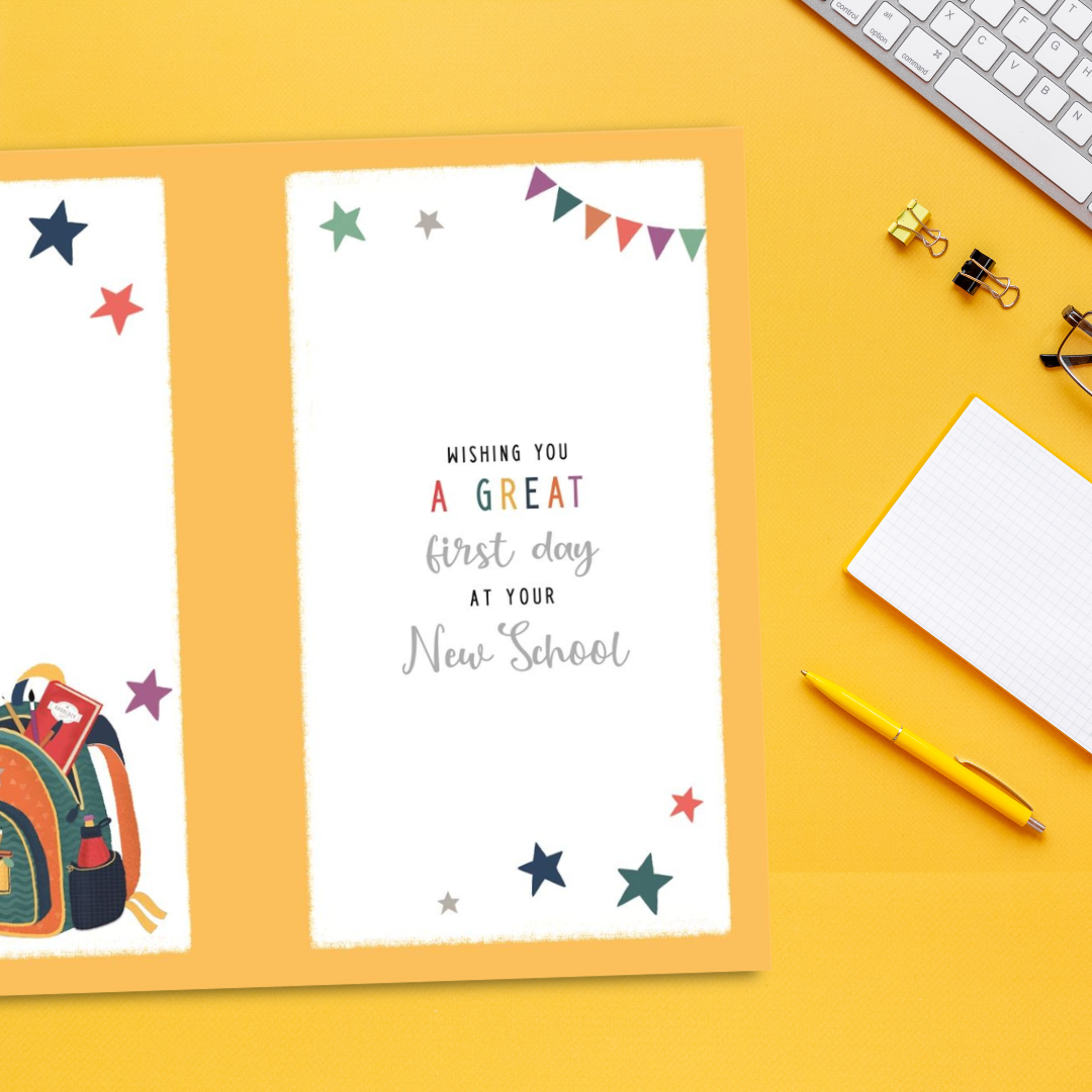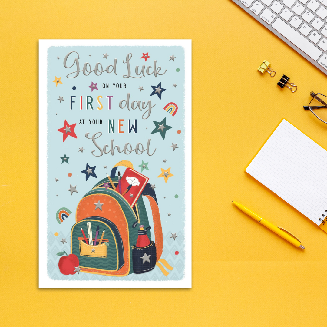 Brilliant Good Luck In New School card with gold foil and colour printed inside.