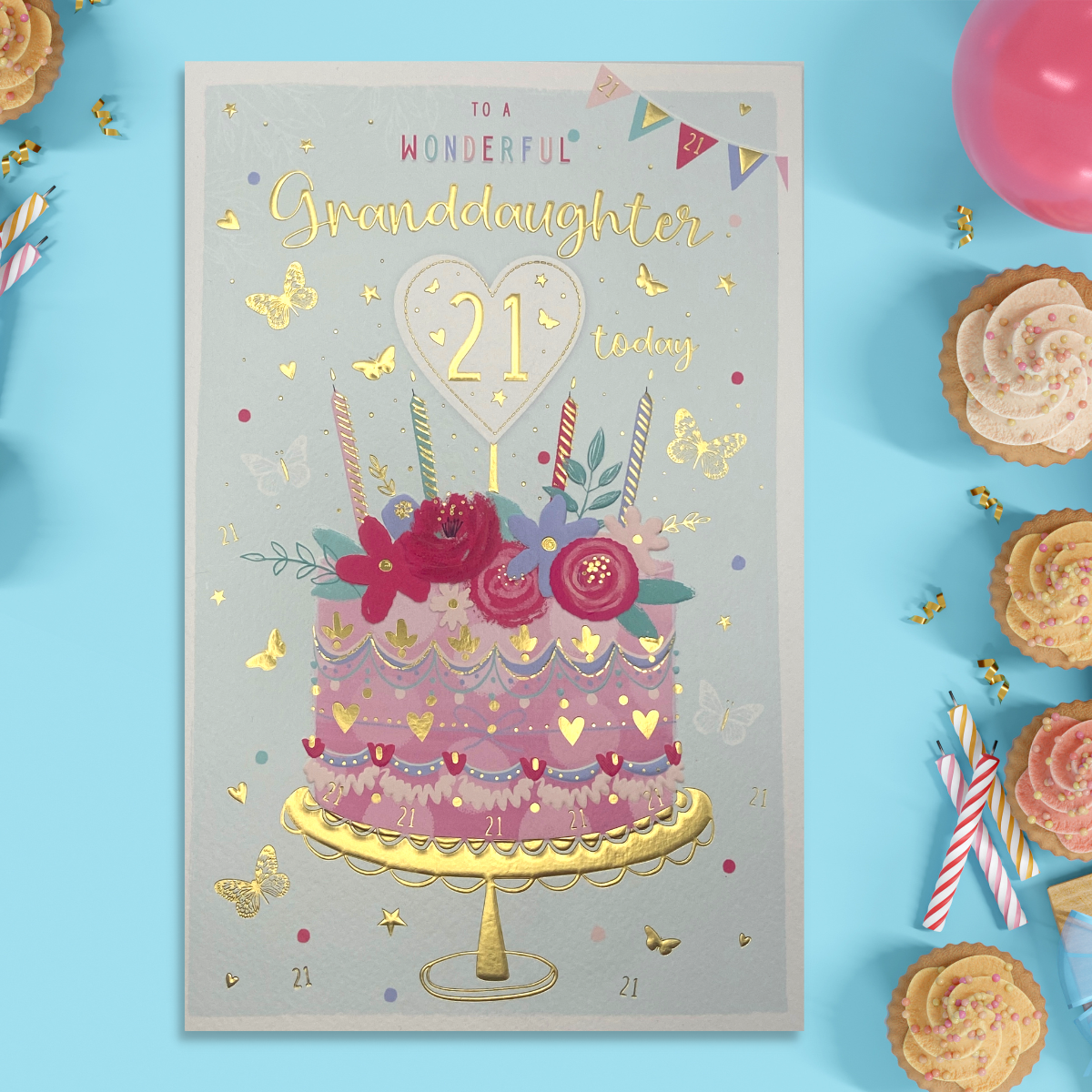 Stunning full colour Granddaughter 21st Birthday large card with gold foil text, embossed details and colour printed insert.