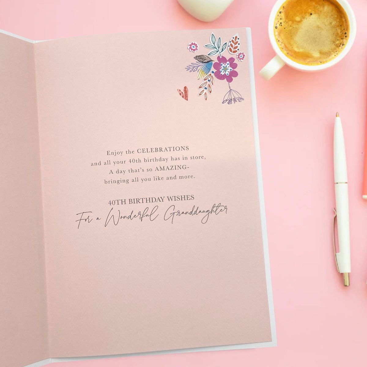 Gorgeous full colour Granddaughter Age 40 Birthday card with gold foil accents and colour printed insert.