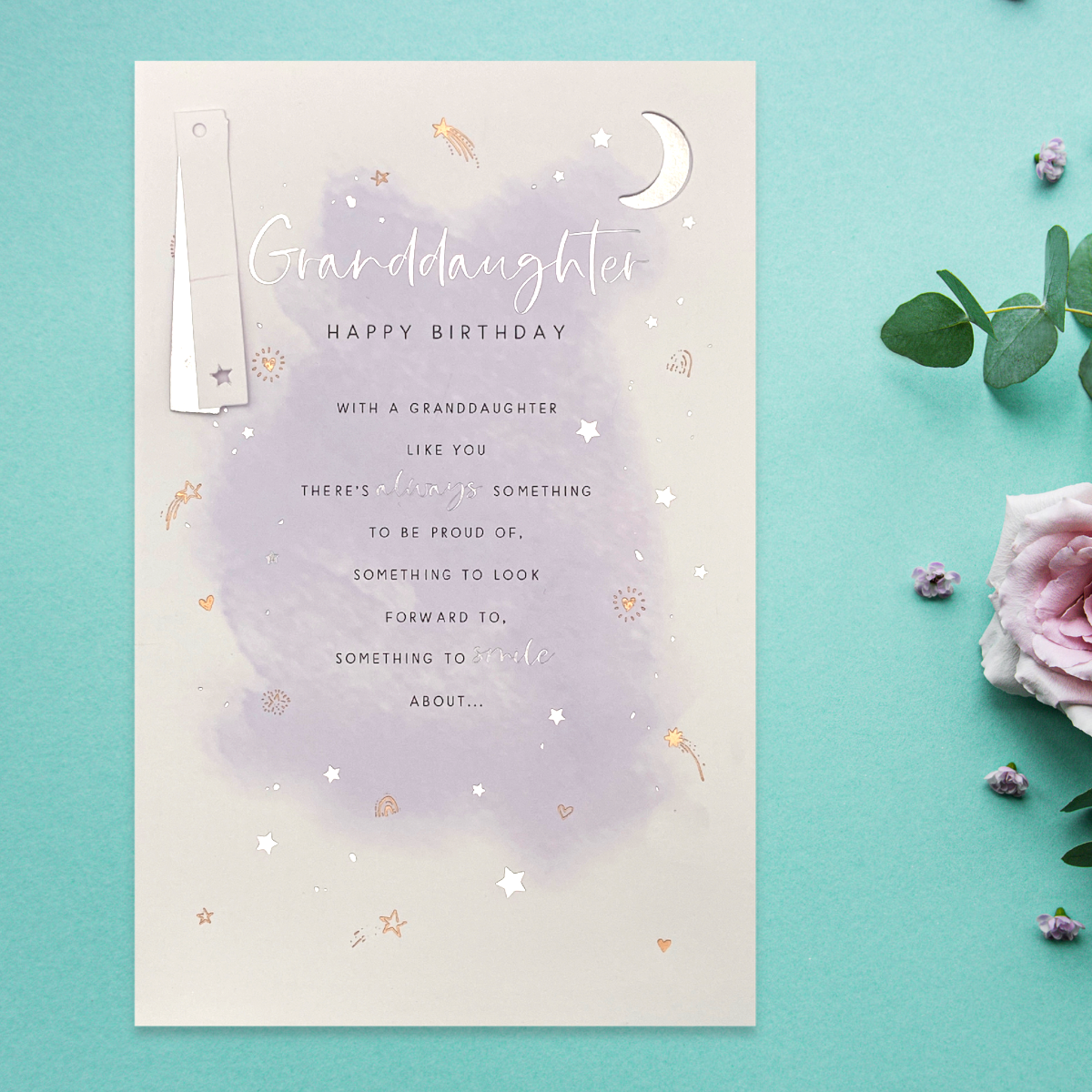 Beautiful Granddaughter Birthday card with decoupage embellishments and cut-out moon. Finished with rose gold and silver foil details.