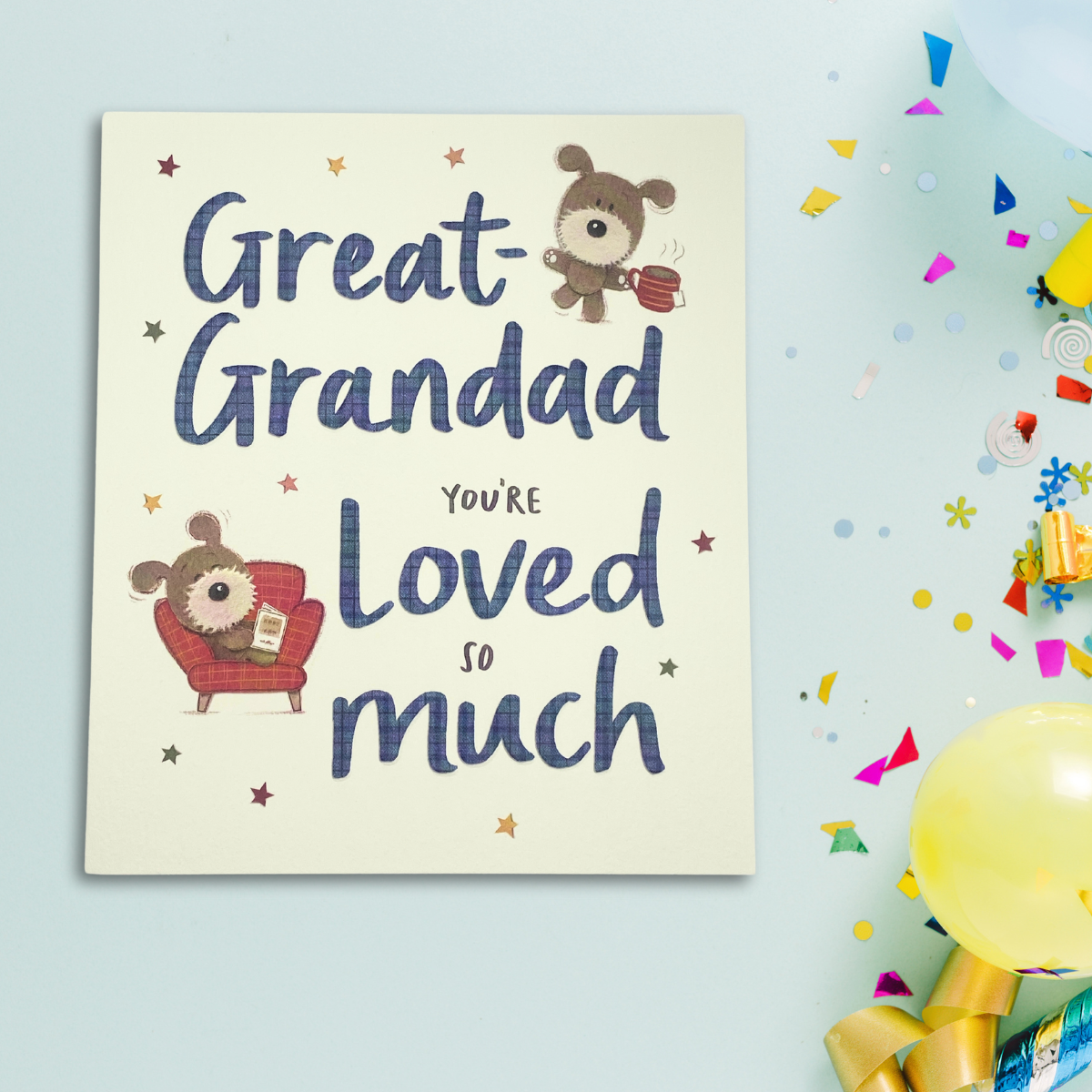 Stunning full colour Great Grandad birthday card complete with embossed details and colour printed inside.