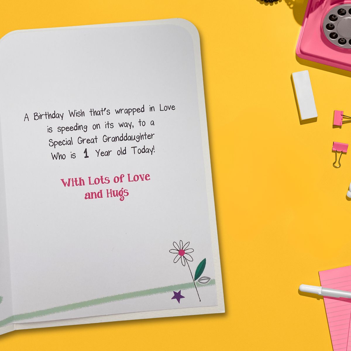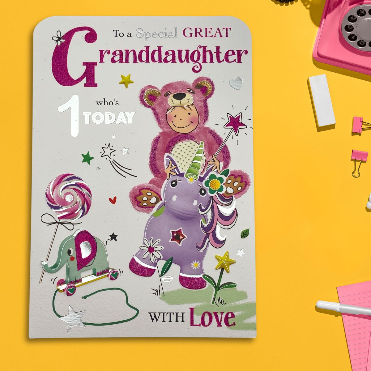 Stunning full colour Great Granddaughter 1st Birthday card from the Twingles collection. With silver foil details added sparkle and colour printed insert.