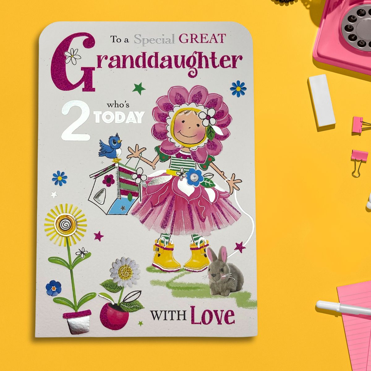 Stunning full colour Great Granddaughter 2nd Birthday card from the Twingles collection complete with silver foil details and colour printed insert.