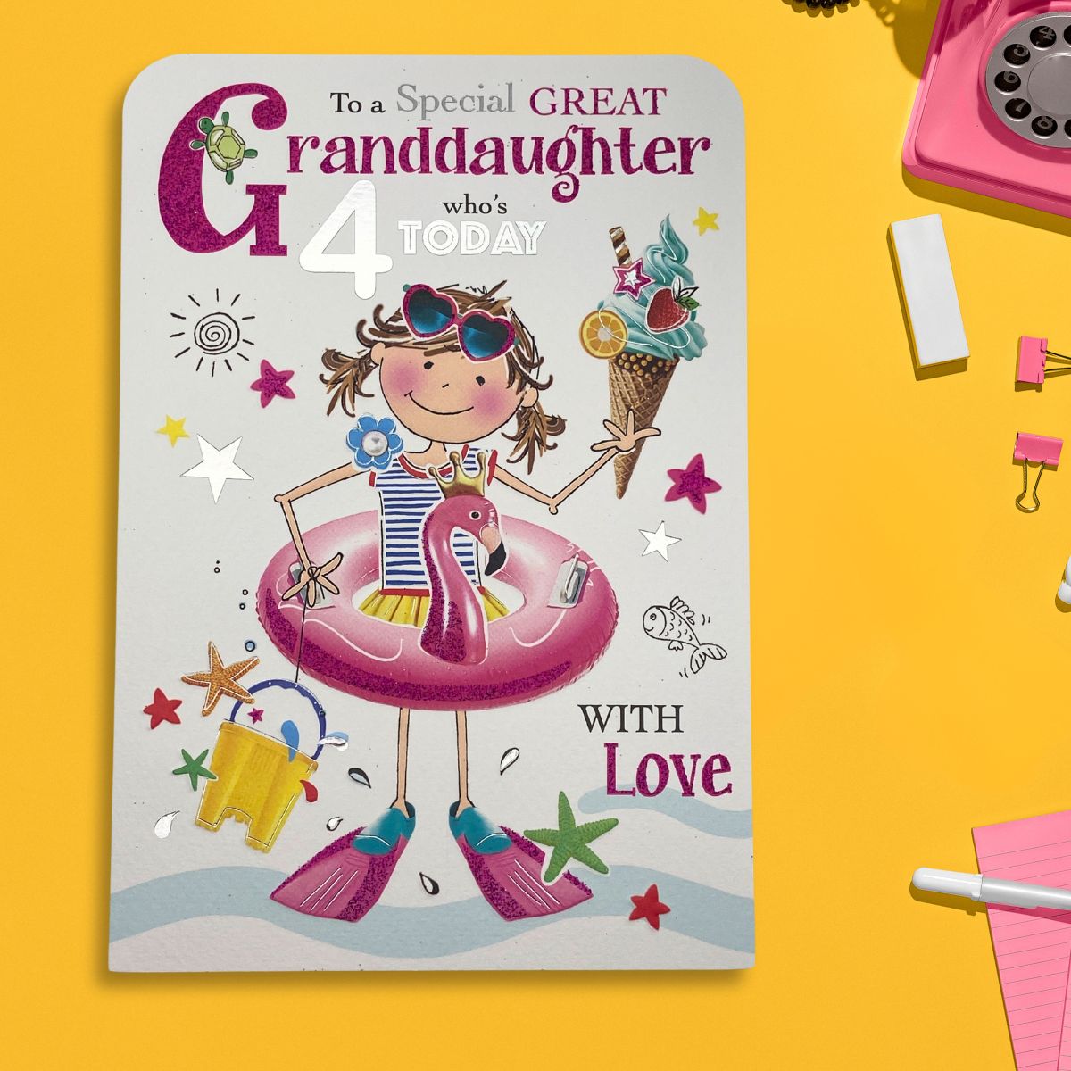 Stunning full colour Great Granddaughter Age 4 Birthday card with embossed lettering and printed insert.