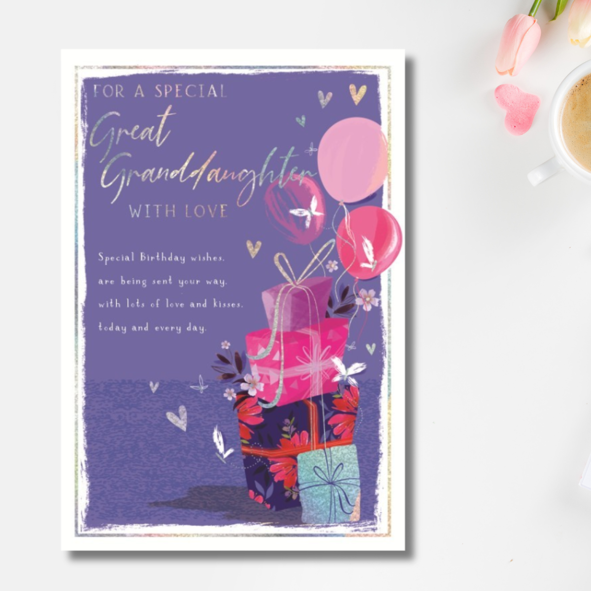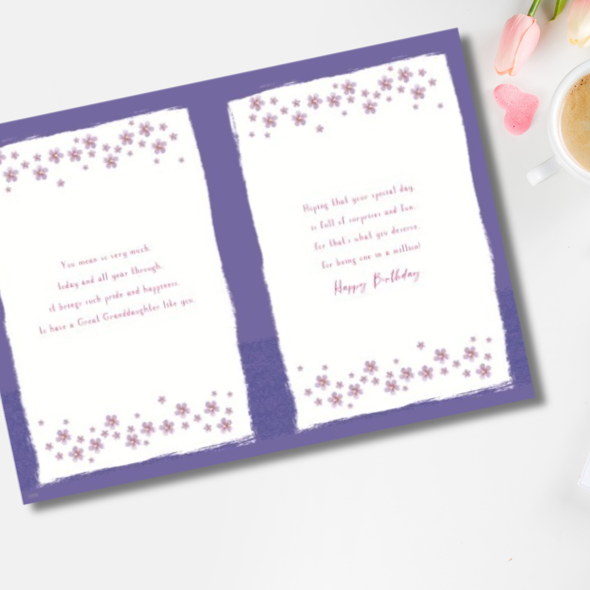 Beautiful full colour Great Granddaughter Birthday card with pink foiled lettering and printed insert.