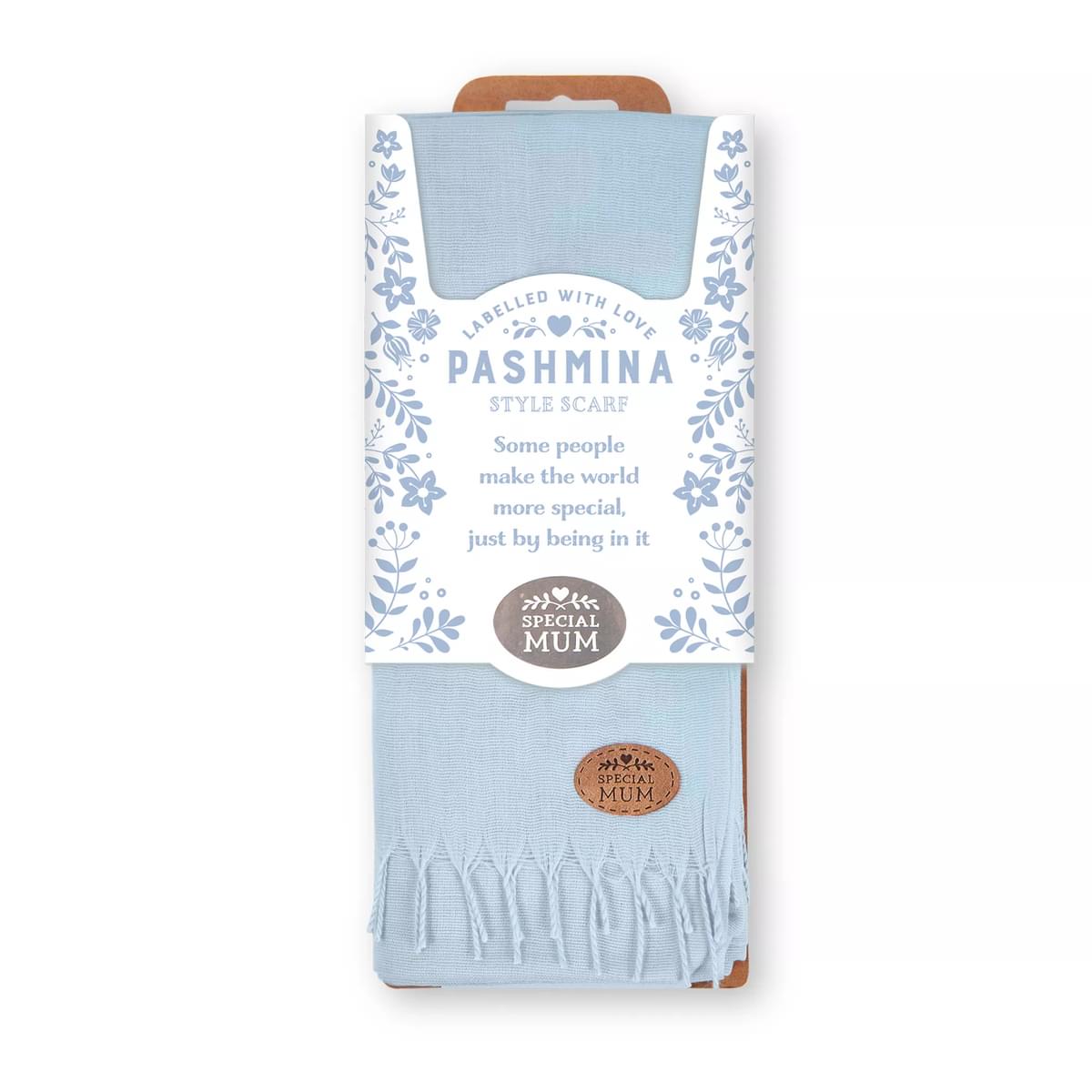 Pashminas are the perfect wardrobe addition or gift. Can be used as a scarf on cold days, a cover up on cool summer evenings or even to brighten up a plain piece of clothing. The perfect gift idea, this blue pashmina scarf comes in pretty floral packaging that features sweet sentiments. This Mum Pashmina has Special Mum personalisation. Sentiment on the packaging reads - Some people make the world more special, just by being in it.