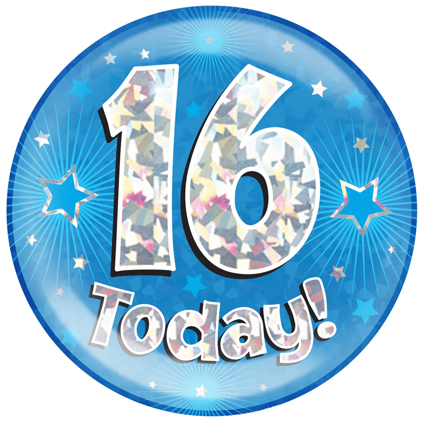 Blue holographic mega badge with '16 Today!' text. Badge comes with pin or stand on the back so you can use as a centrepiece.