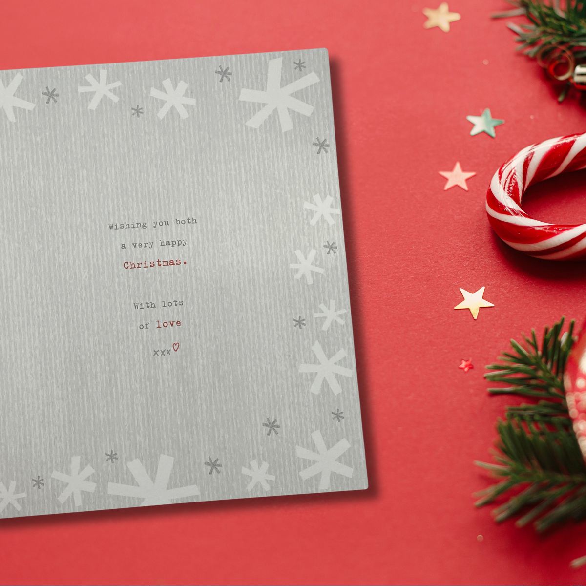 Fantastic Mum & Dad Christmas card from the Boofle collection. Finished with silver foil detail and colour printed inside.