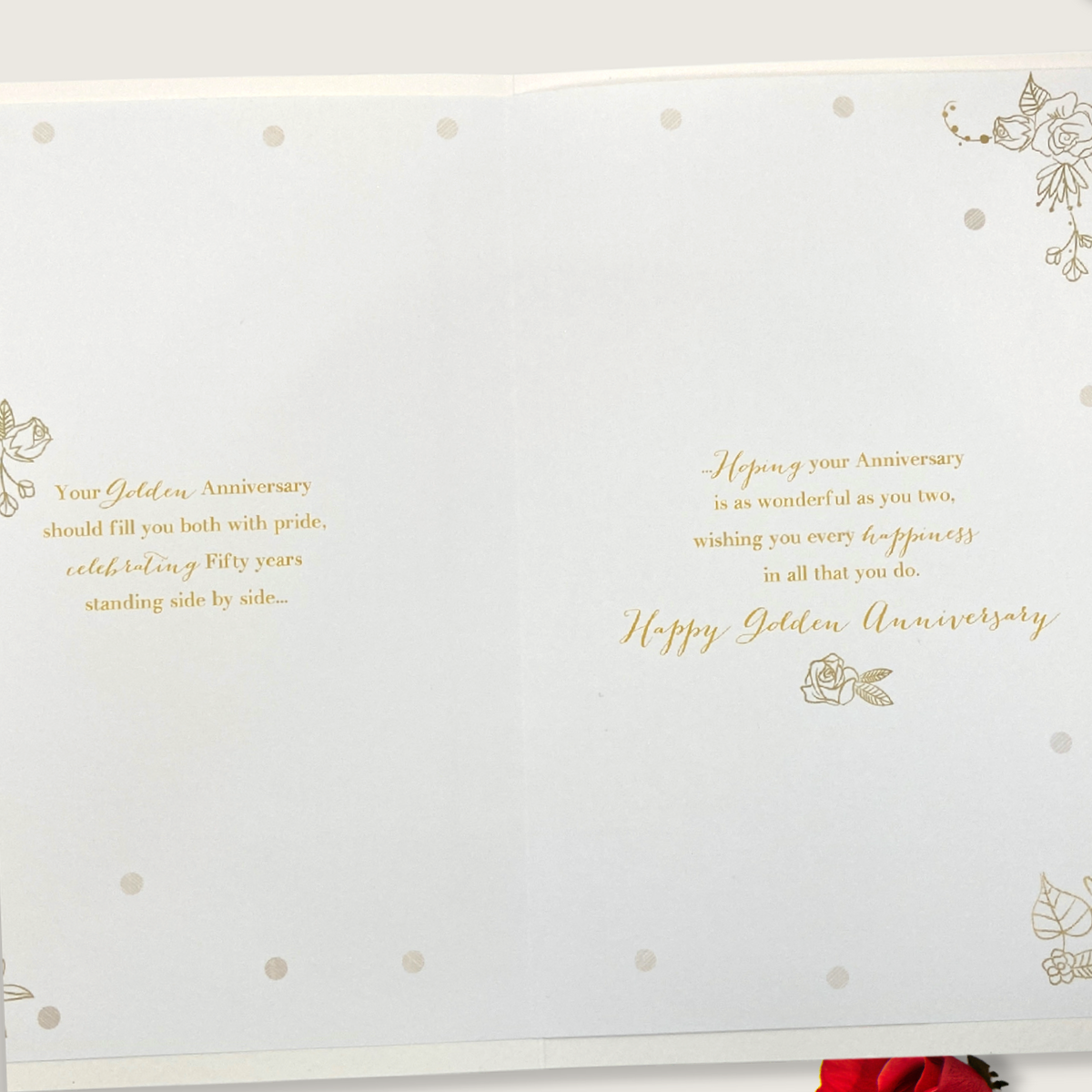Stunning full colour textured Mum & Dad On Your Golden Anniversary card with colour printed insert and gold foiled details.