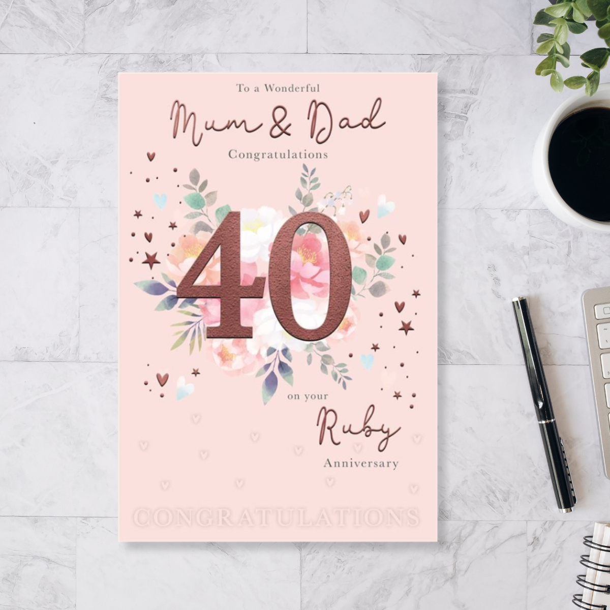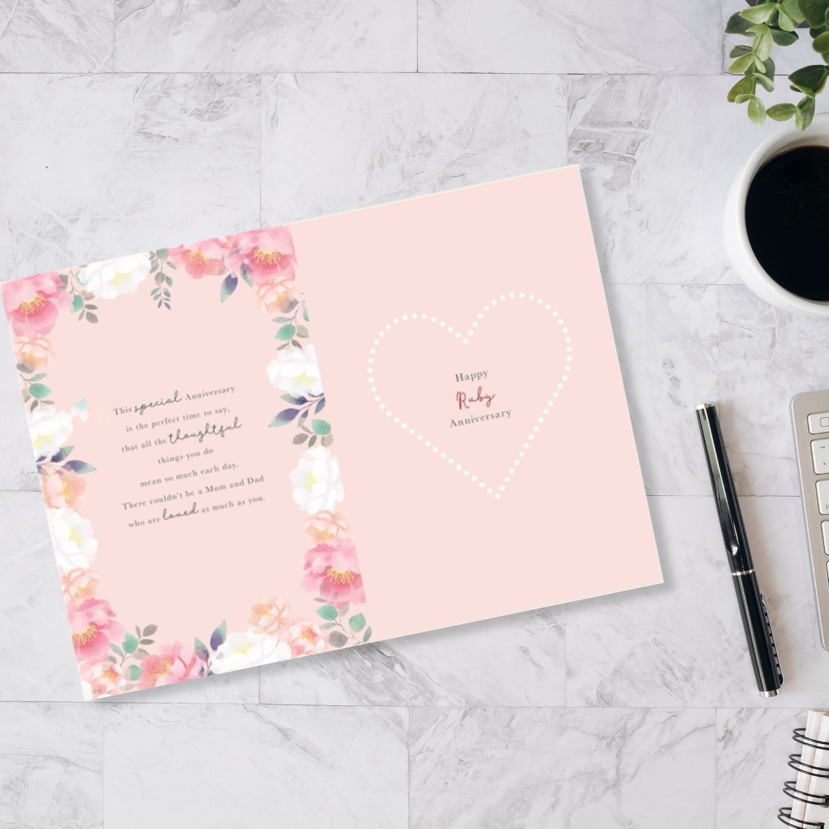 Stunning full colour Mum & Dad Ruby Wedding Anniversary card complete with foiled lettering and printed insert.