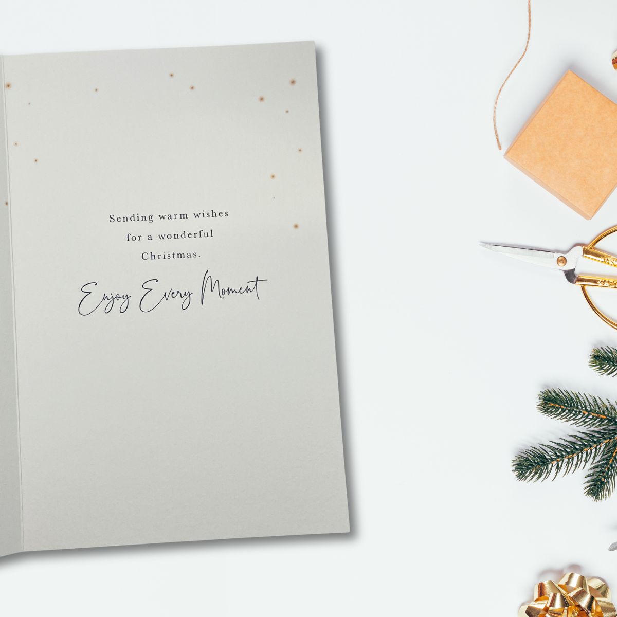 Beautiful, full colour Christmas card complete with gold foil details and colour printed inside.