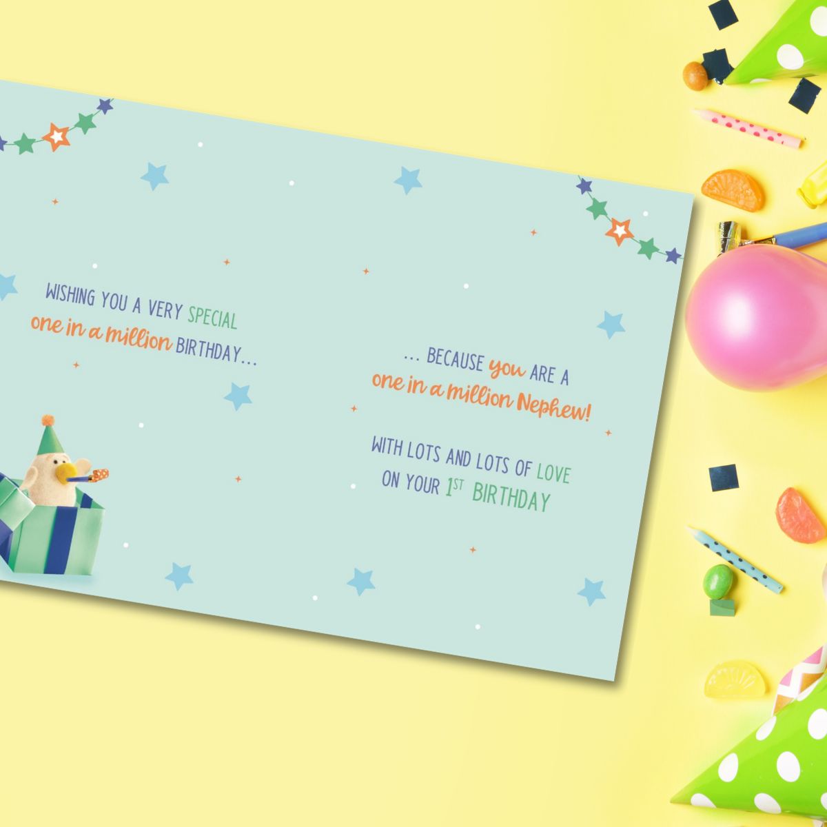 Stunning full colour Nephew 1st Birthday card with embossed lettering and insert.