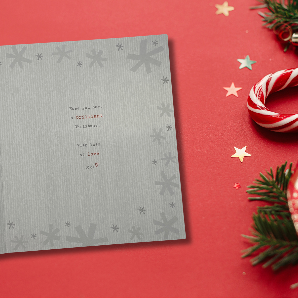 Fantastic Nephew Christmas card from the Boofle collection. Finished with silver foil detail and colour printed inside.