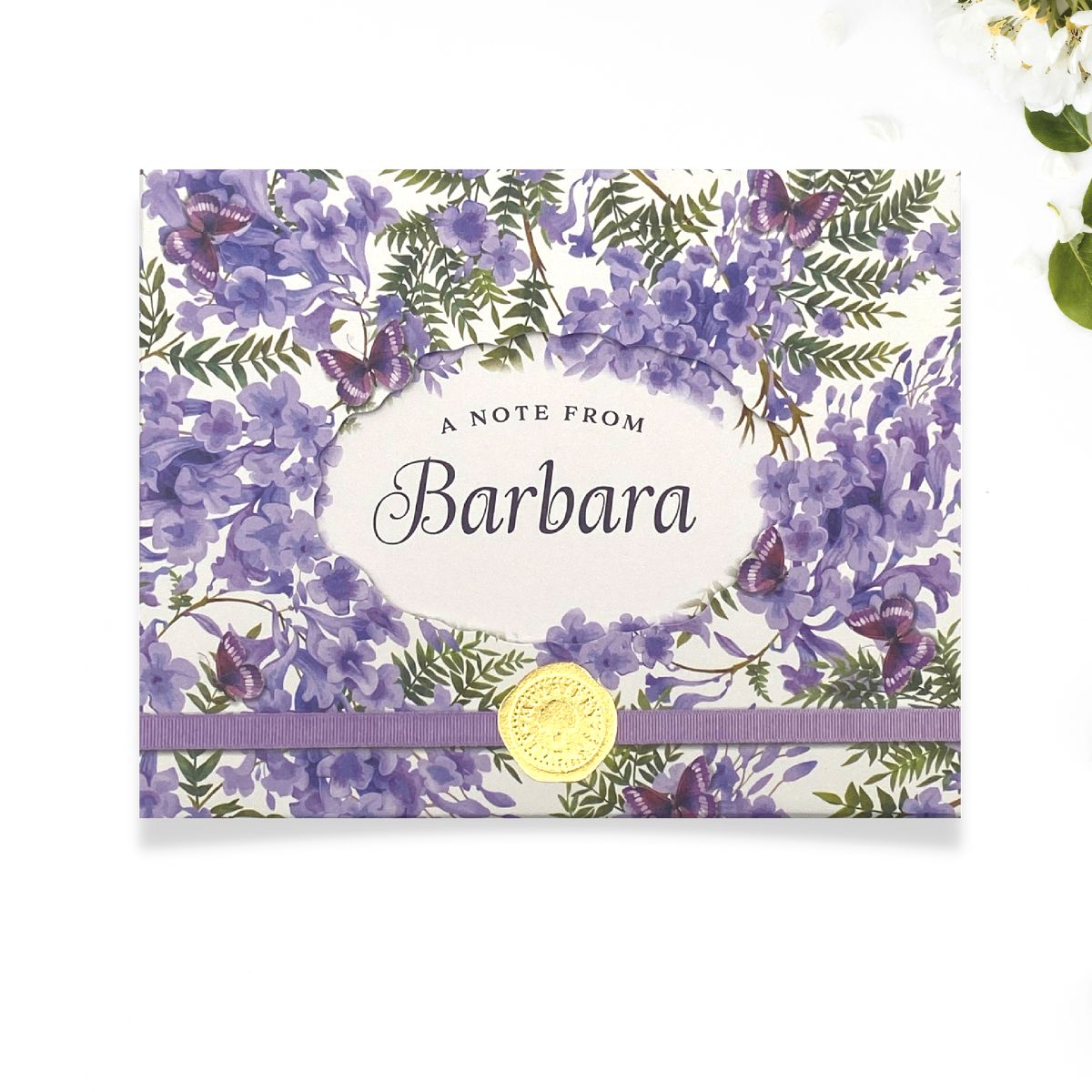 Fabulous floral Notelets by Rosalind & Hebe. 8 Personalised Floral notelets with envelopes delivered in pretty floral case. Blank inside for your own message.