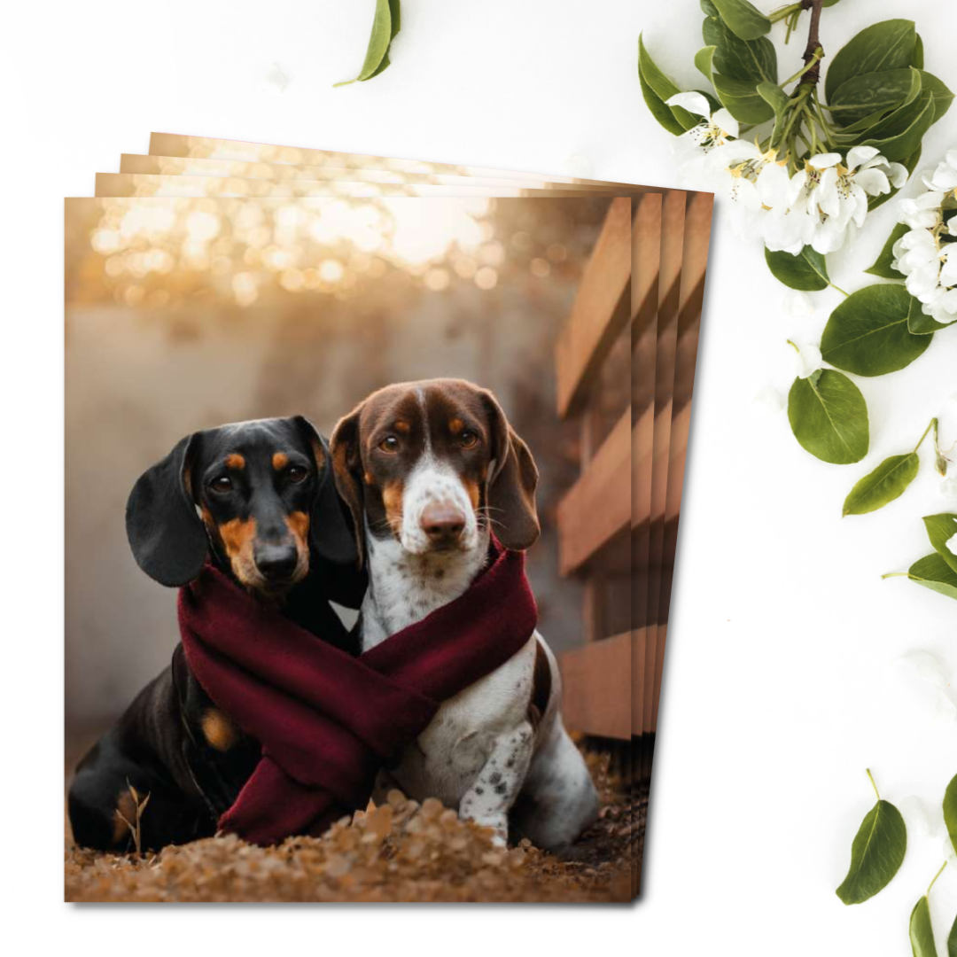 Beautiful pack of Notelet cards featuring cute dogs wrapped in a scarf.