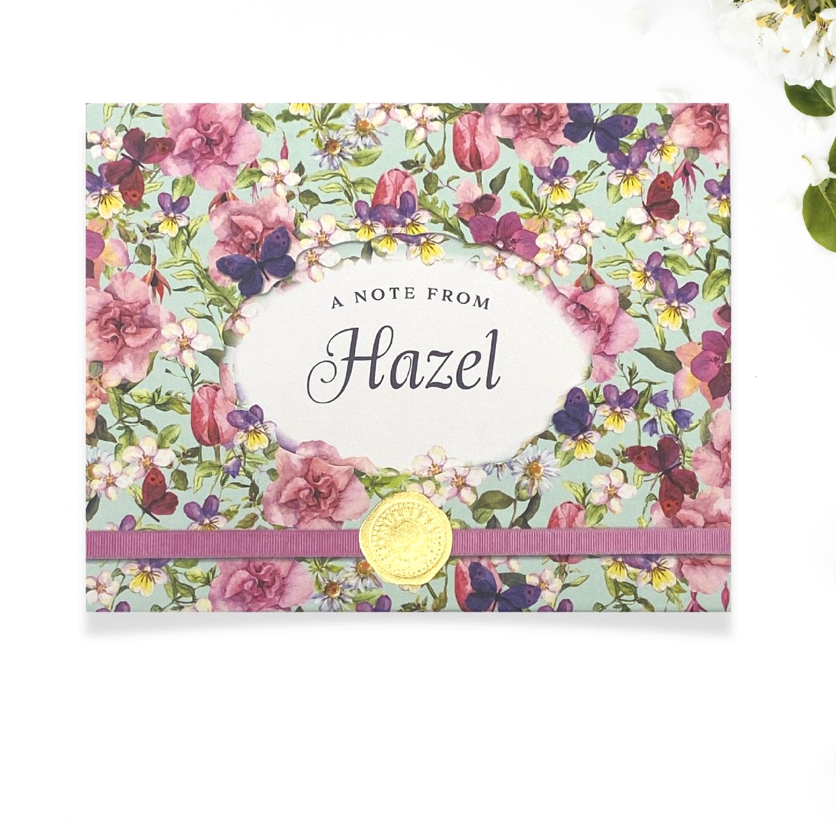 Fabulous floral Notelets by Rosalind & Hebe. 8 Personalised Floral notelets with envelopes delivered in pretty floral case. Blank inside for your own message.