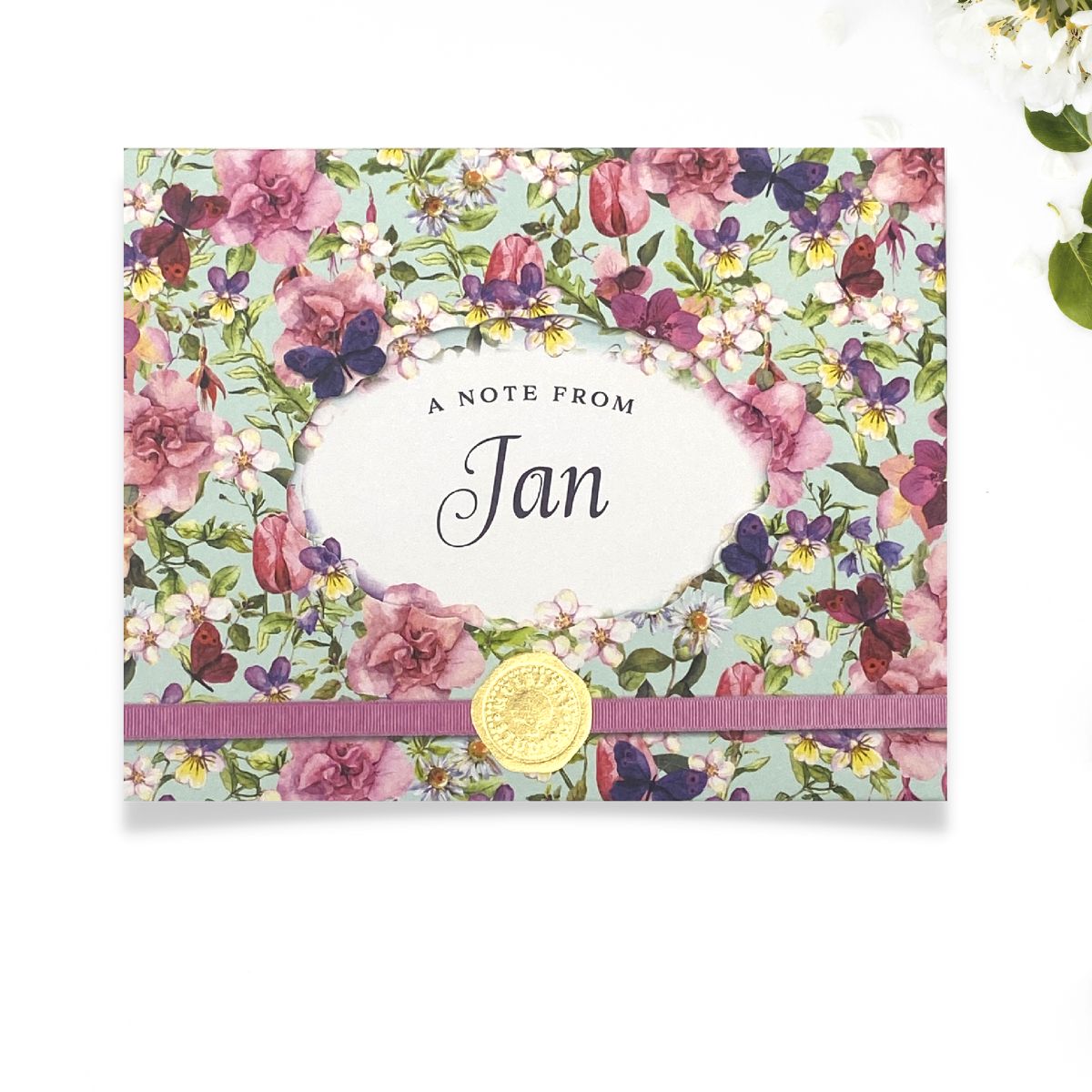 Fabulous floral Notelets by Rosalind & Hebe. 8 Personalised Floral notelets with envelopes delivered in pretty floral case. Blank inside for your own message.