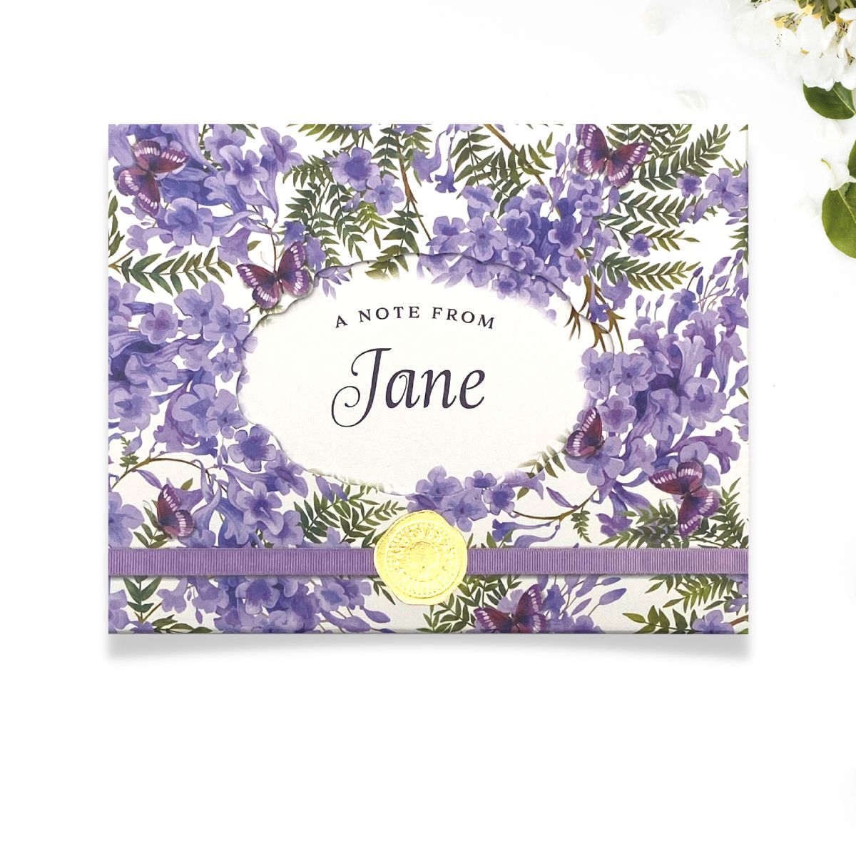 Fabulous floral Notelets by Rosalind & Hebe. 8 Personalised Floral notelets with envelopes delivered in pretty floral case. Blank inside for your own message.