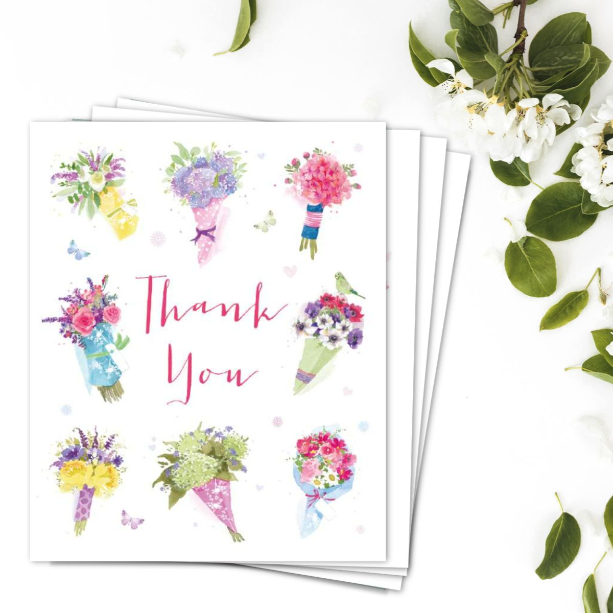 Beautiful pack of Thank You Notelet cards featuring bunches of flowers.