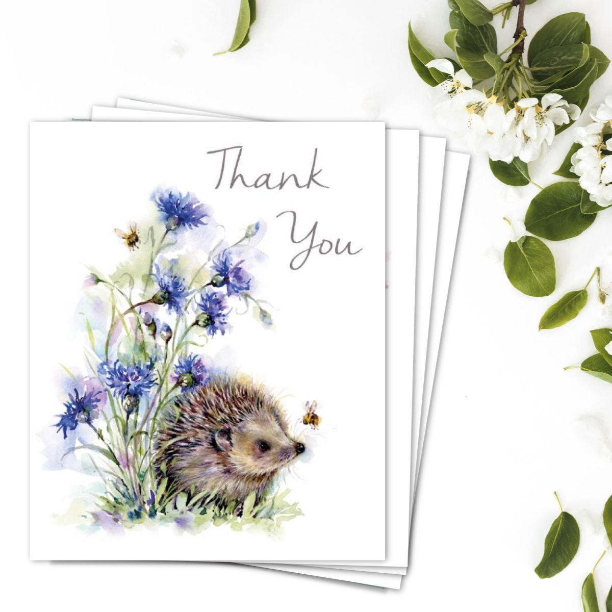 Beautiful pack of Thank You Notelet cards featuring a hedgehog among the flowers.
