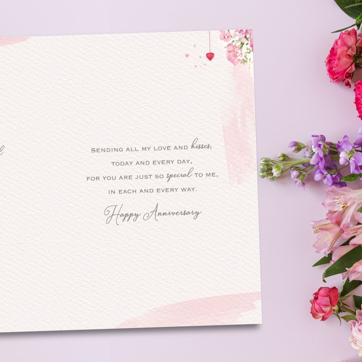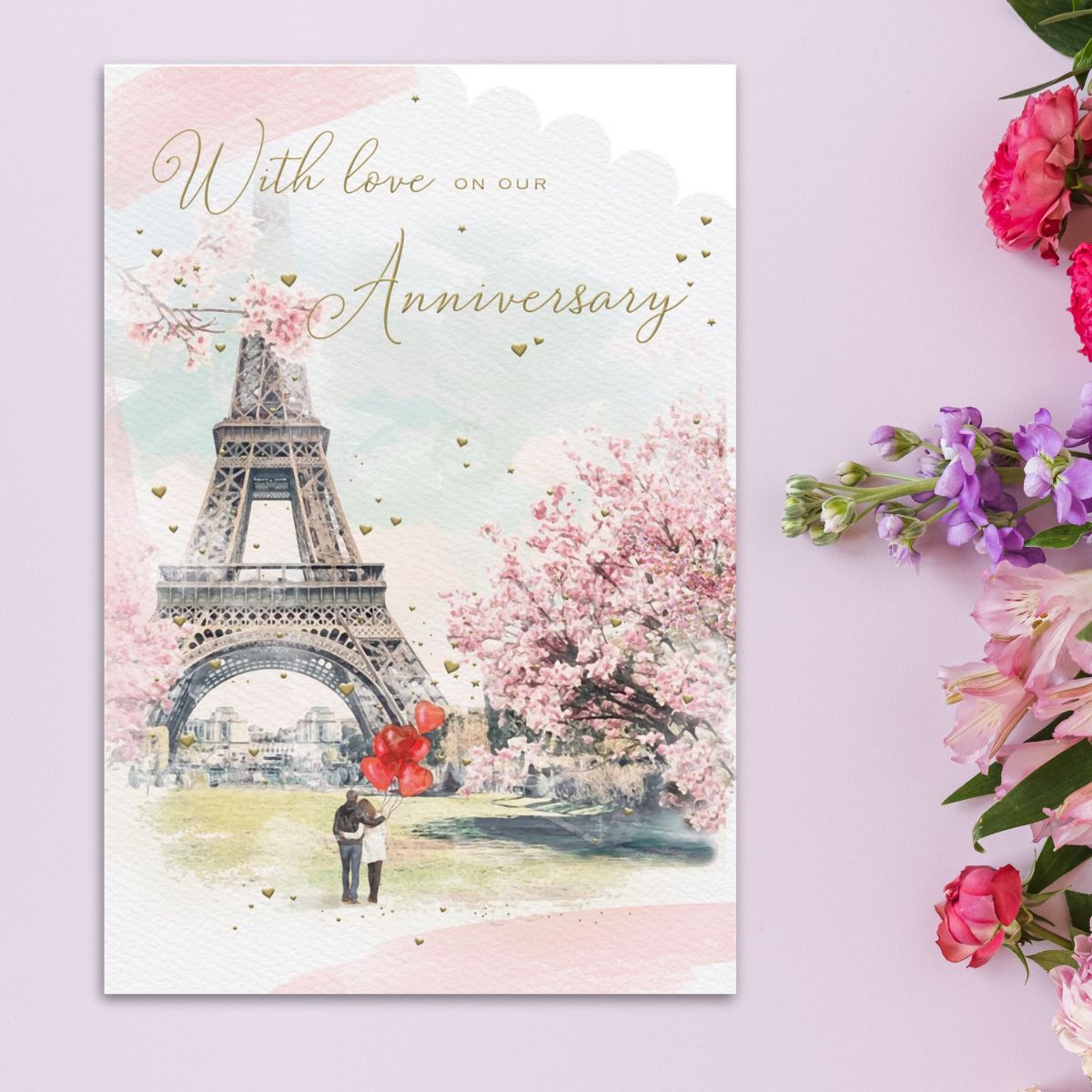 Fabulous textured Our Anniversary card from the Brighstone collection with rose gold foiling details and colour printed insert. Finished with decorated envelope.