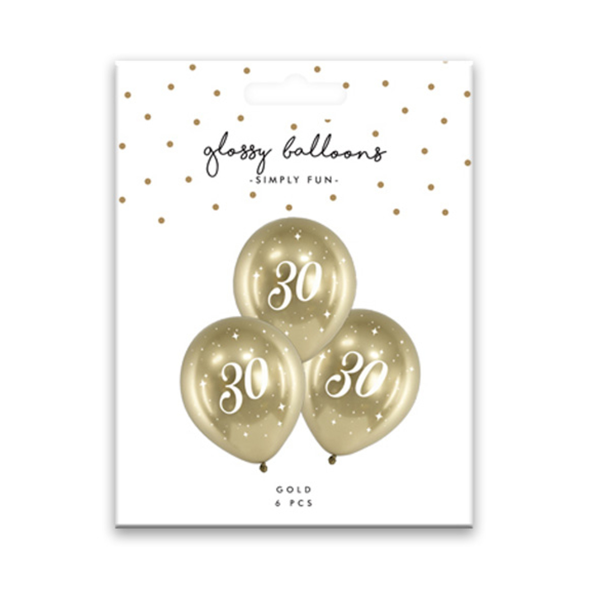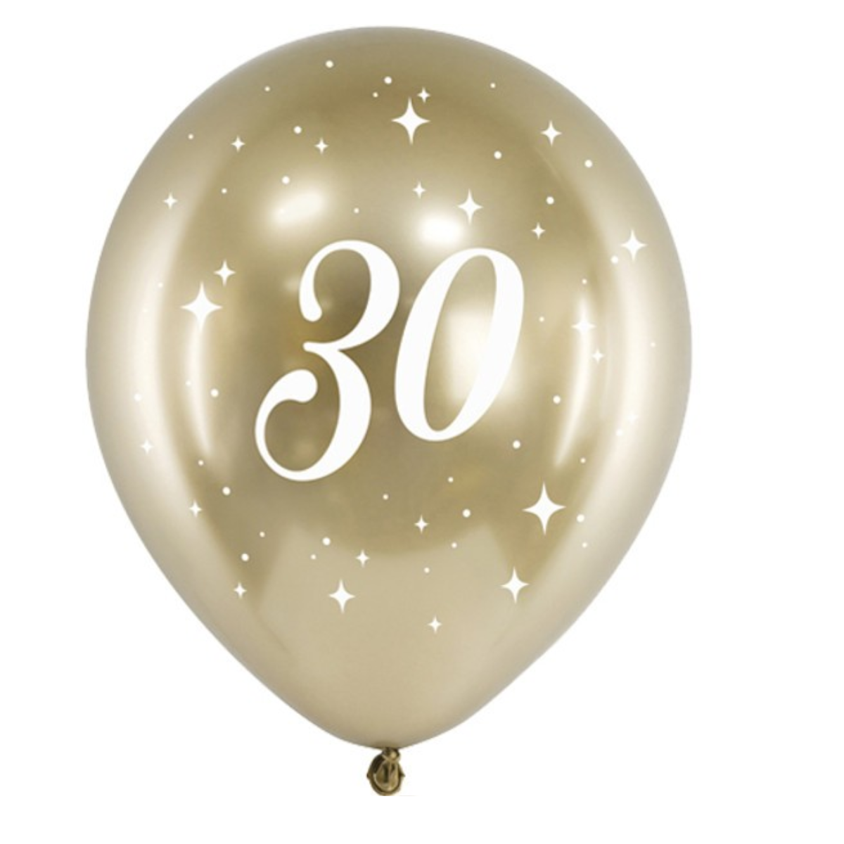 Celebrate an 30th birthday in style with these pretty 12 inch gold gloss latex. Each glossy gold balloon has a white star print with the number 30. Supplied in a pack of 6.