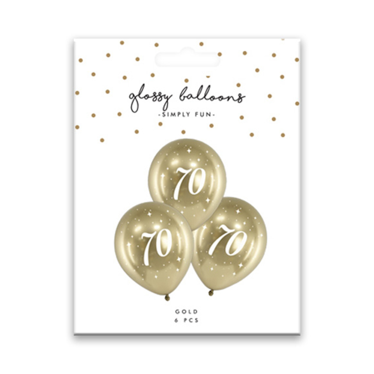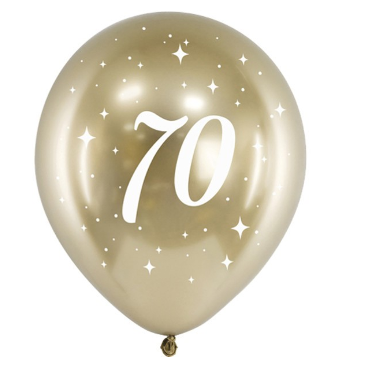Celebrate an 70th birthday in style with these pretty 12 inch gold gloss latex. Each glossy gold balloon has a white star print with the number 70. Supplied in a pack of 6.