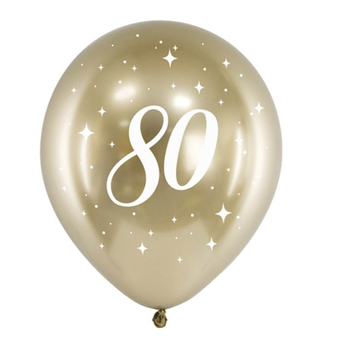 Celebrate an 80th birthday in style with these pretty 12 inch gold gloss latex. Each glossy gold balloon has a white star print with the number 80. Supplied in a pack of 6.
