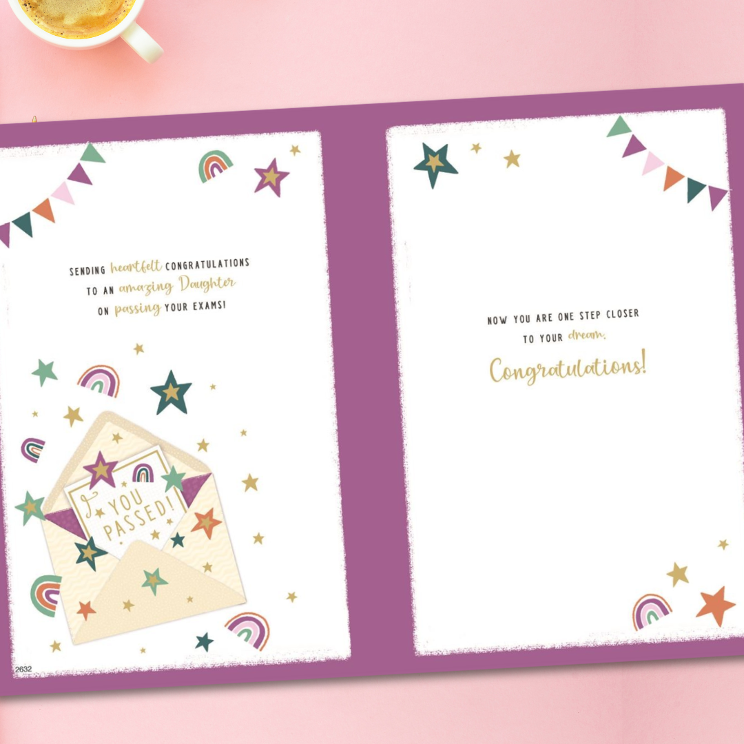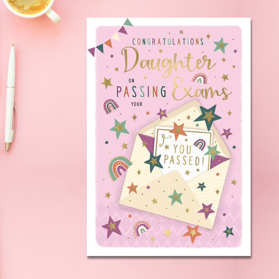 Fabulous embossed Daughter Exam Congratulations card complete with gold foiled detail and printed insert.