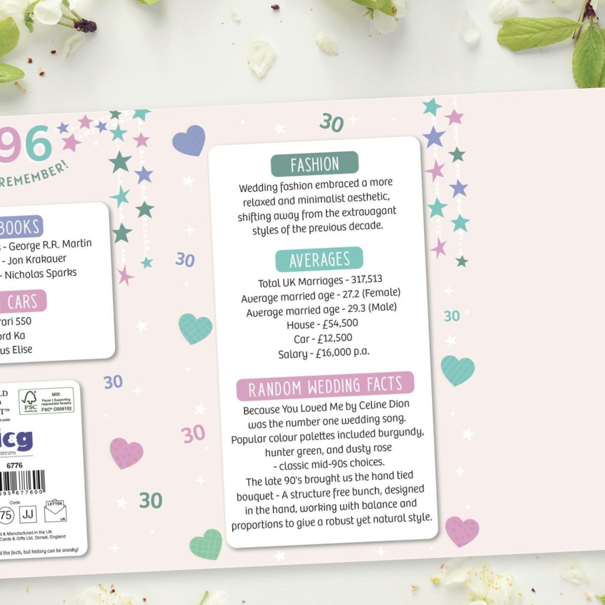 Stunning full colour 3-fold, embossed Pearl Wedding Anniversary card with silver foil details with colour printed inside with fun facts about 1996.