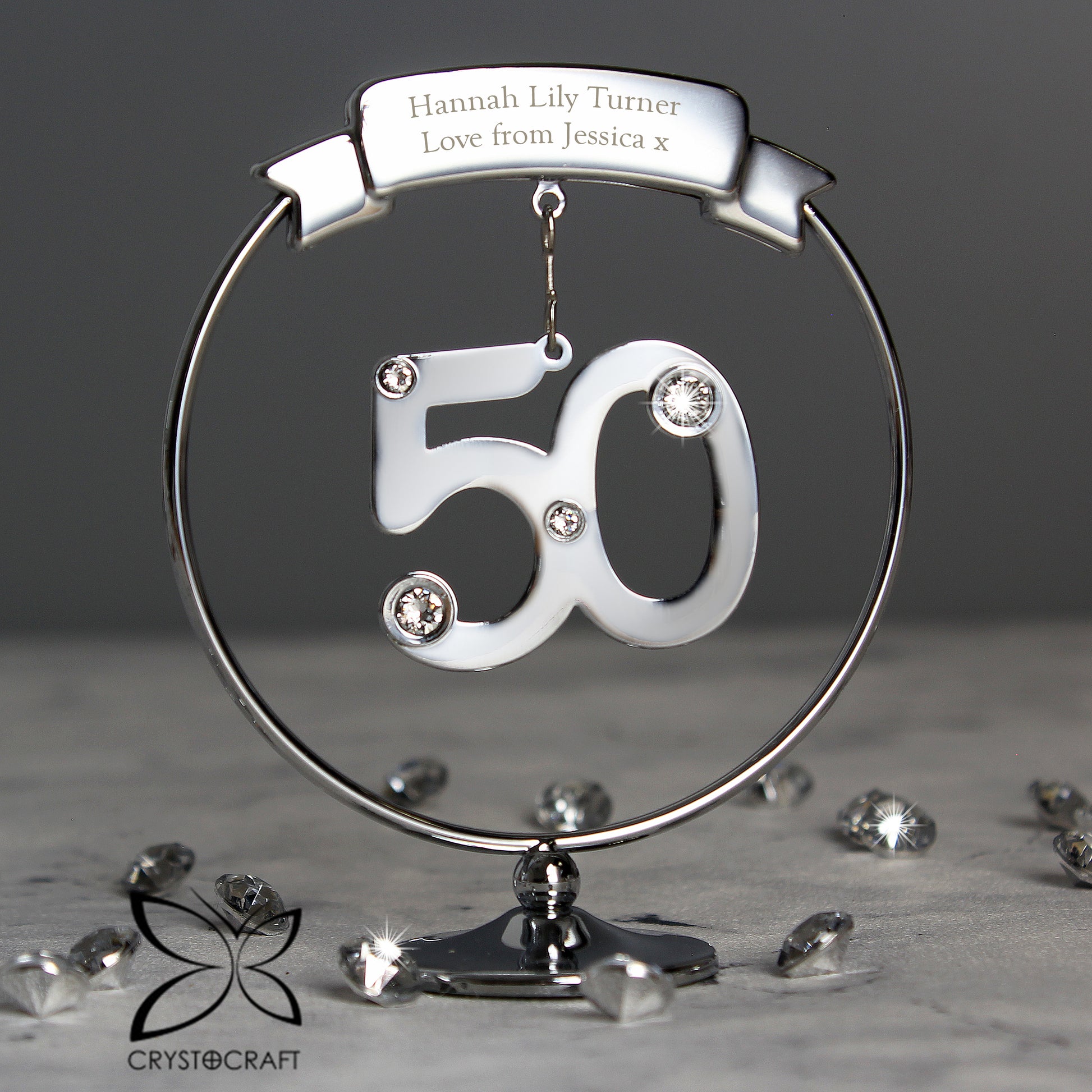 Mark a special 50th Birthday or Wedding Anniversary with this elegant Crystocraft ornament. Dangling from a personalised round silver stand is a crystal clad 50. This will catch the light and bring a smile to the recipients face.