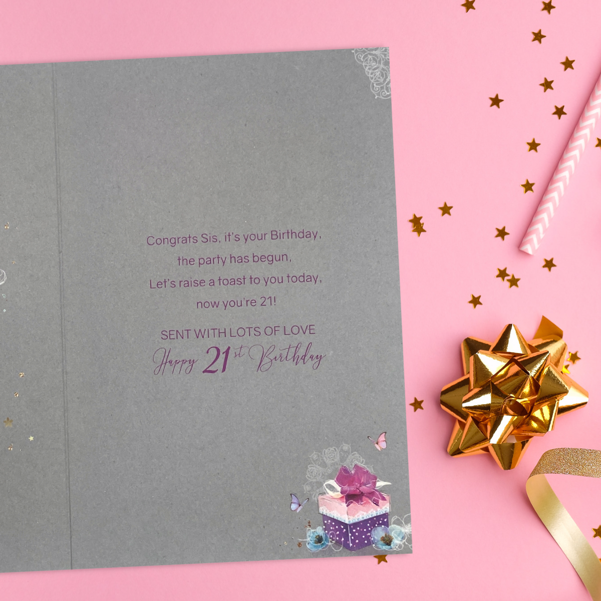Stunning full colour Sister 21st Birthday card from the Grace collection with gold foil details and fabulous colour printed inside.