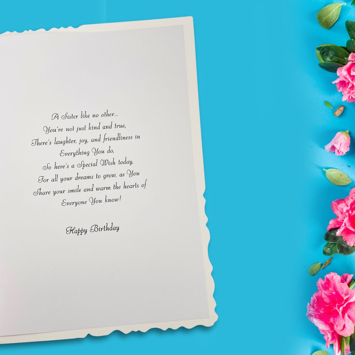 Stunning full colour Sister birthday large card from the Velvet collection with silver foil details, die-cut edge and colour printed insert.