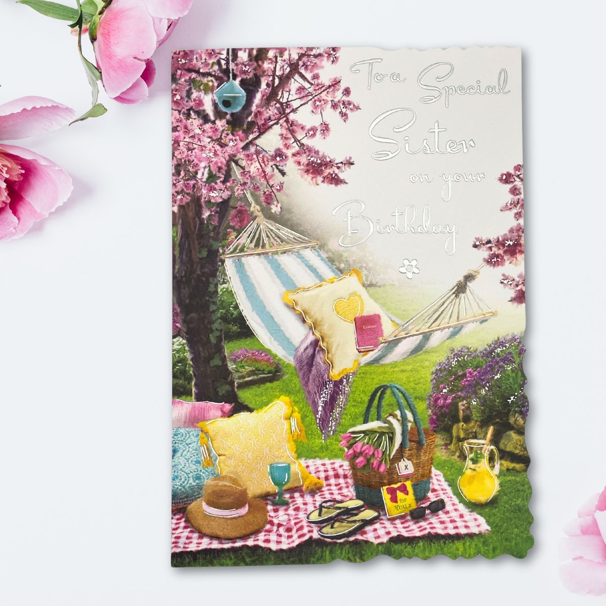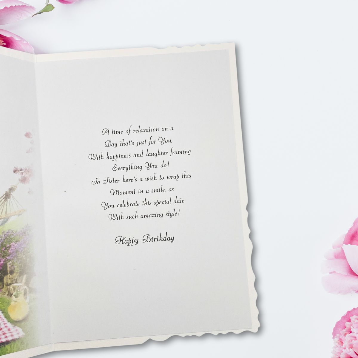 Gorgeous full colour Sister Birthday card from the Velvet collection with die-cut edge, silver foiling details.. Completed with beautiful colour printed insert and heartfelt words.