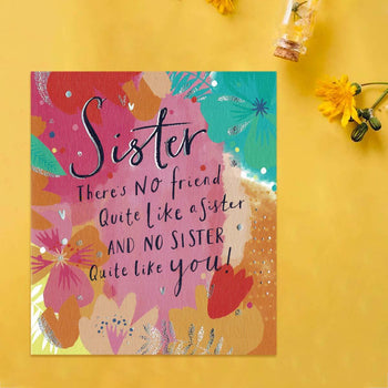 Fabulous full colour Sister Birthday greeting card complete with silver foil details and colour printed inside.