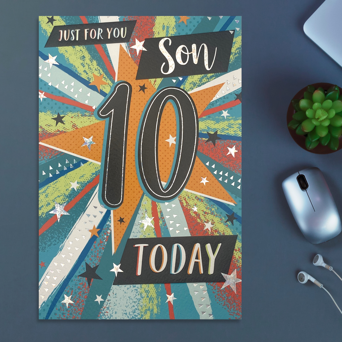 Stunning full colour Son Age 10 birthday card complete with silver foil details and printed insert.