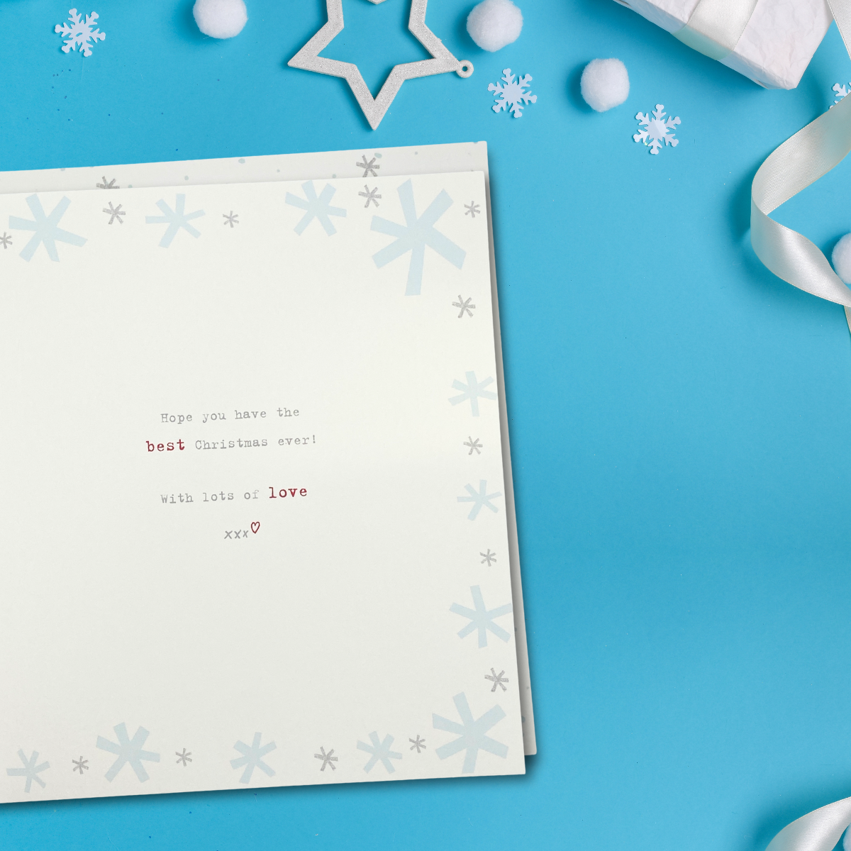 Gorgeous textured Son Christmas card from the Boofle Bear collection with silver foil details and colour printed inside.