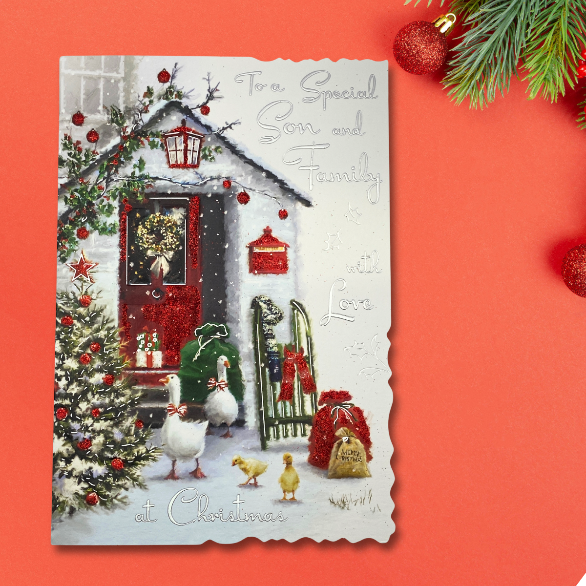 Gorgeous full colour Son & Family Christmas card from the Velvet collection. Finished with silver foil accents, added sparkle and colour printed insert.