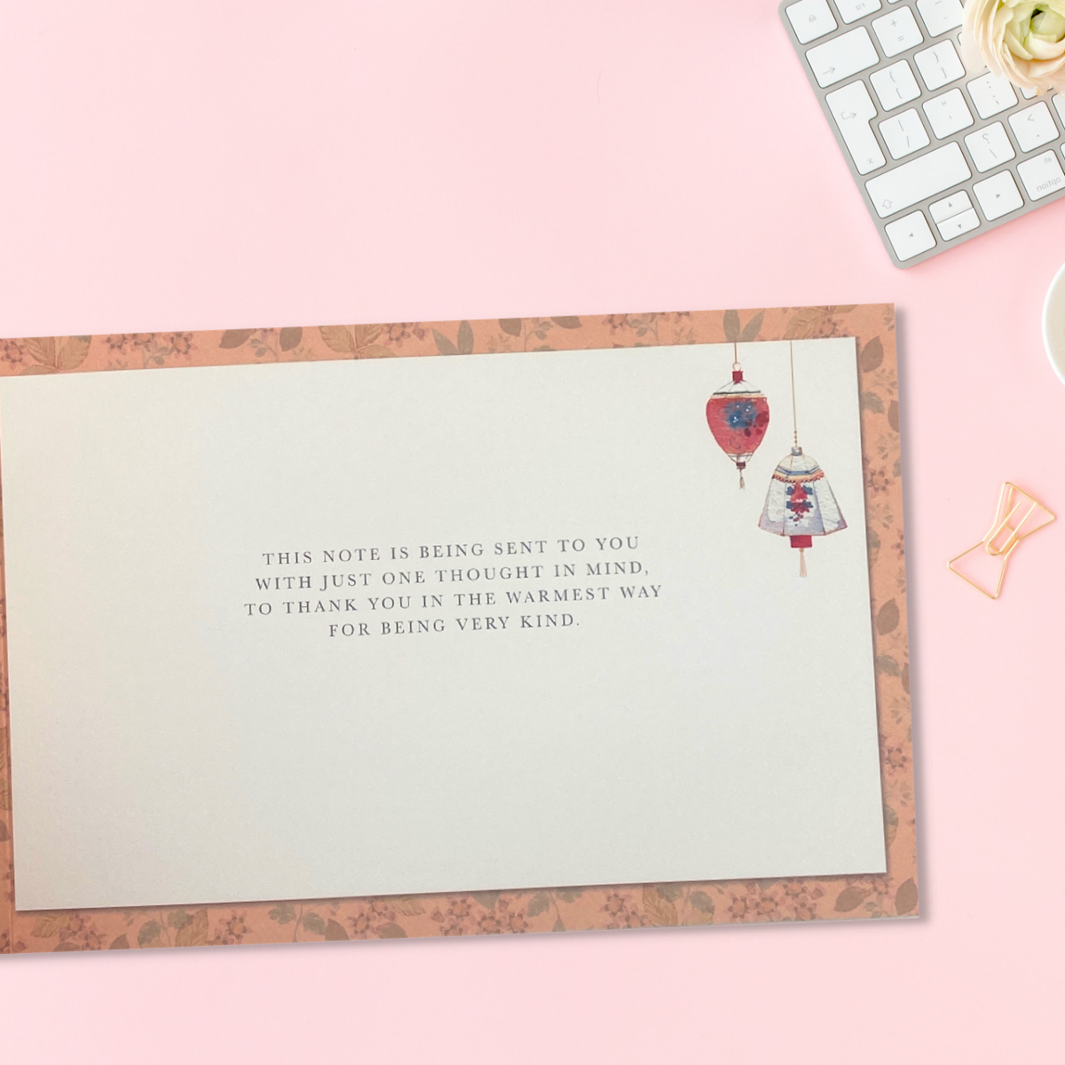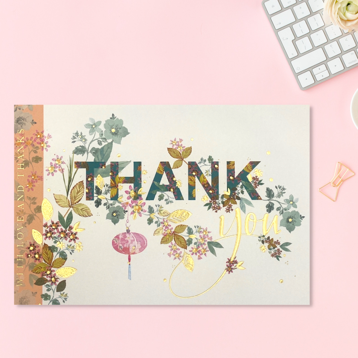 Gorgeous full colour Thank You card from the Blossom collection with beautiful gold foil details. Finished with colour printed inside.