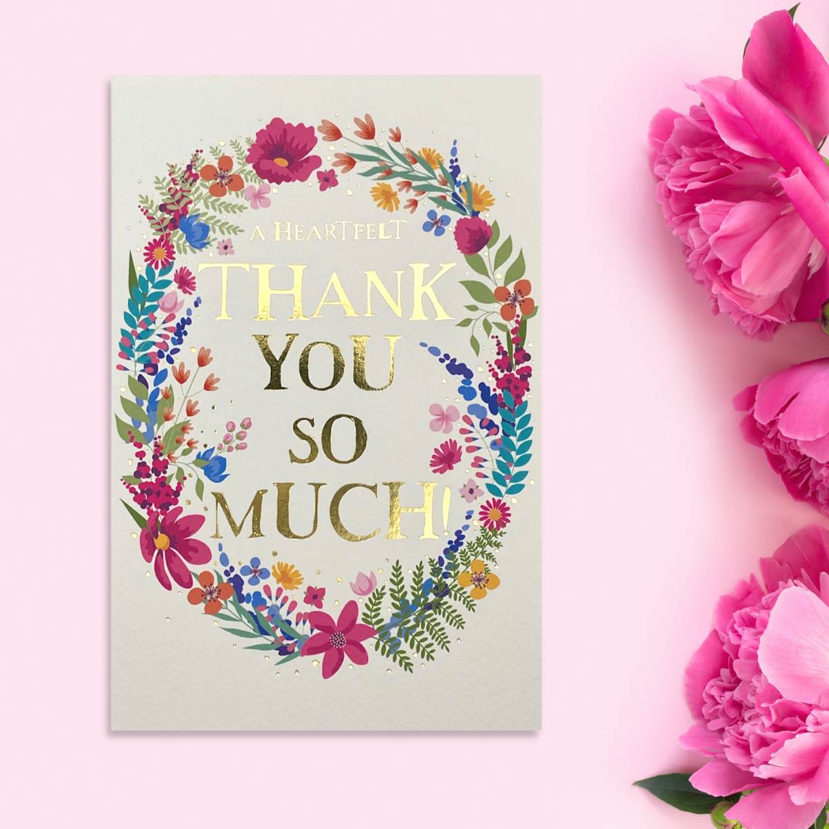 Stunning full colour textured Thank You card with beautiful silver coloured foil details and vibrant colour printed inside.