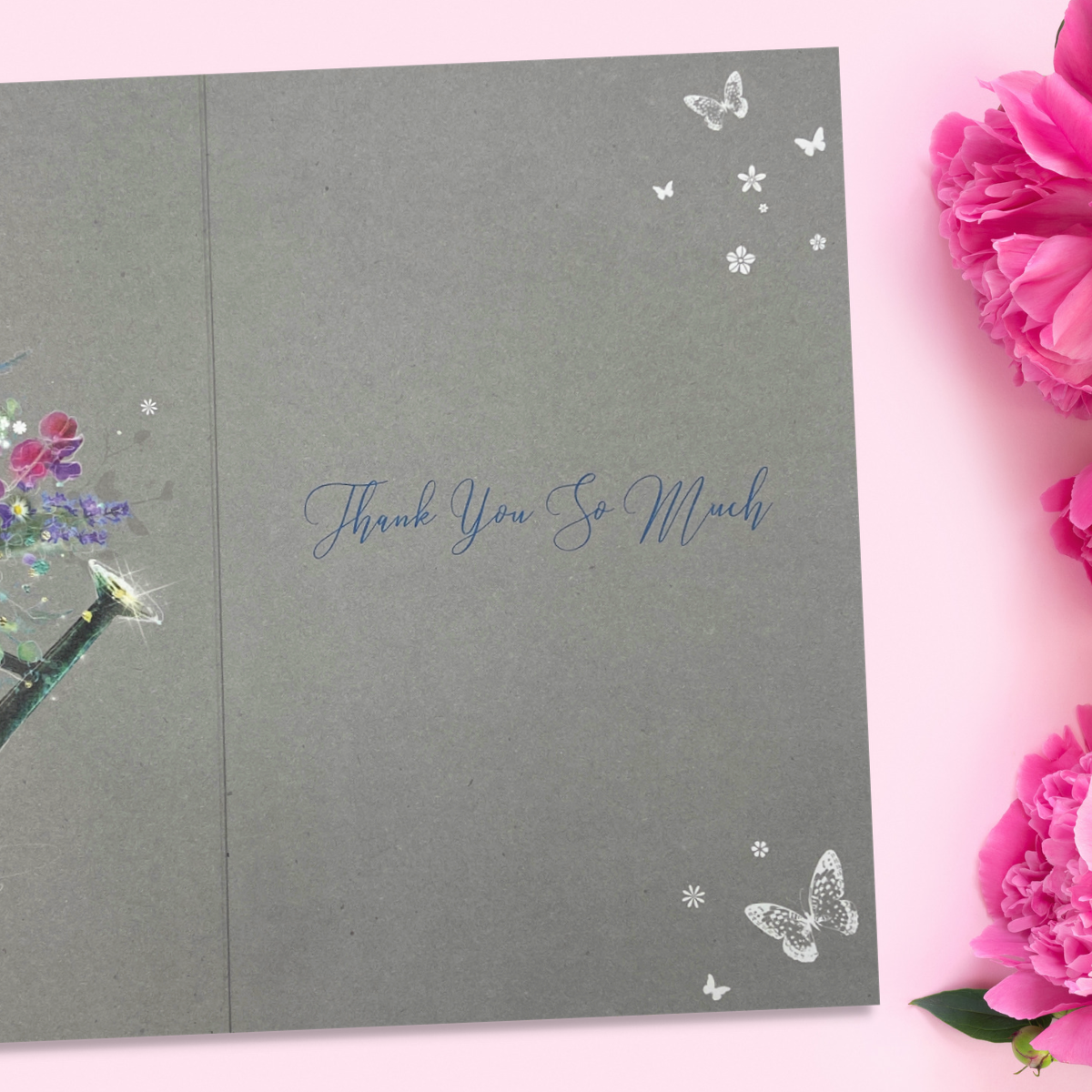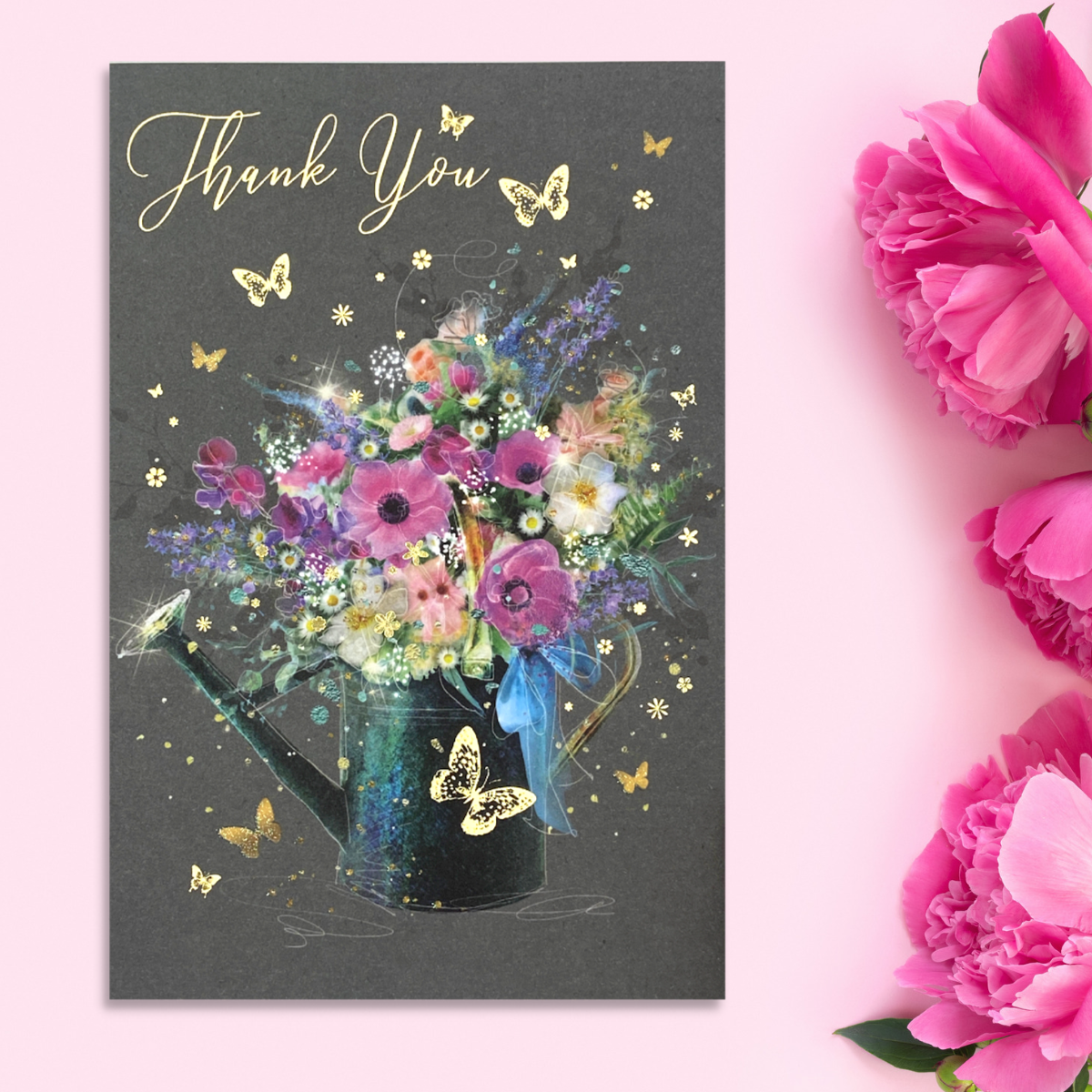 Stunning full colour Thank You card from the beautiful Grace collection. With gold foil details and colour printed inside with full page image. Finished with gold coloured envelope.