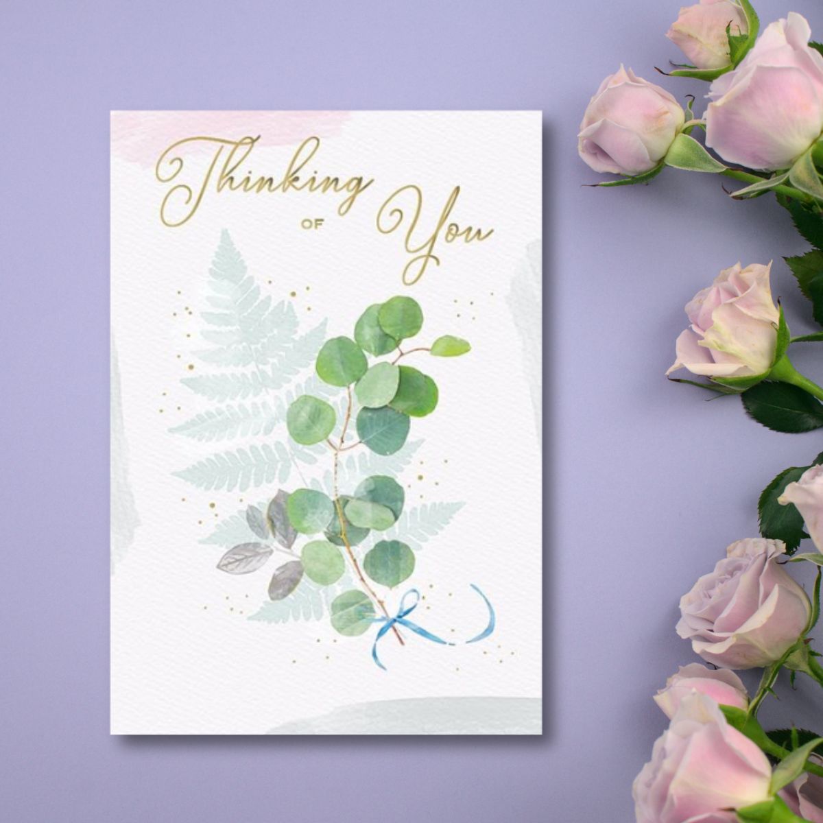 Beautiful full colour Thinking Of You card with gold foil details and colour printed insert.