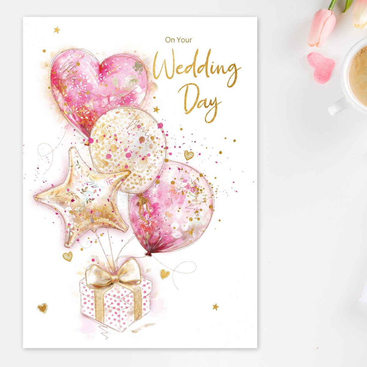 Fabulous large Wedding Day card with gifts and balloons, with added foil details.
