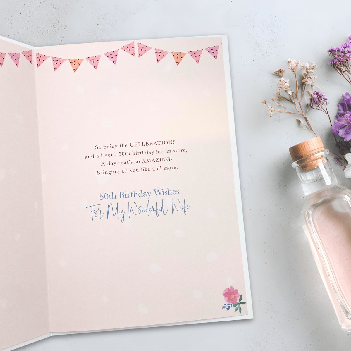 Gorgeous full colour Wife 50th Birthday card with rose gold foil accents, textured finish and colour printed insert.