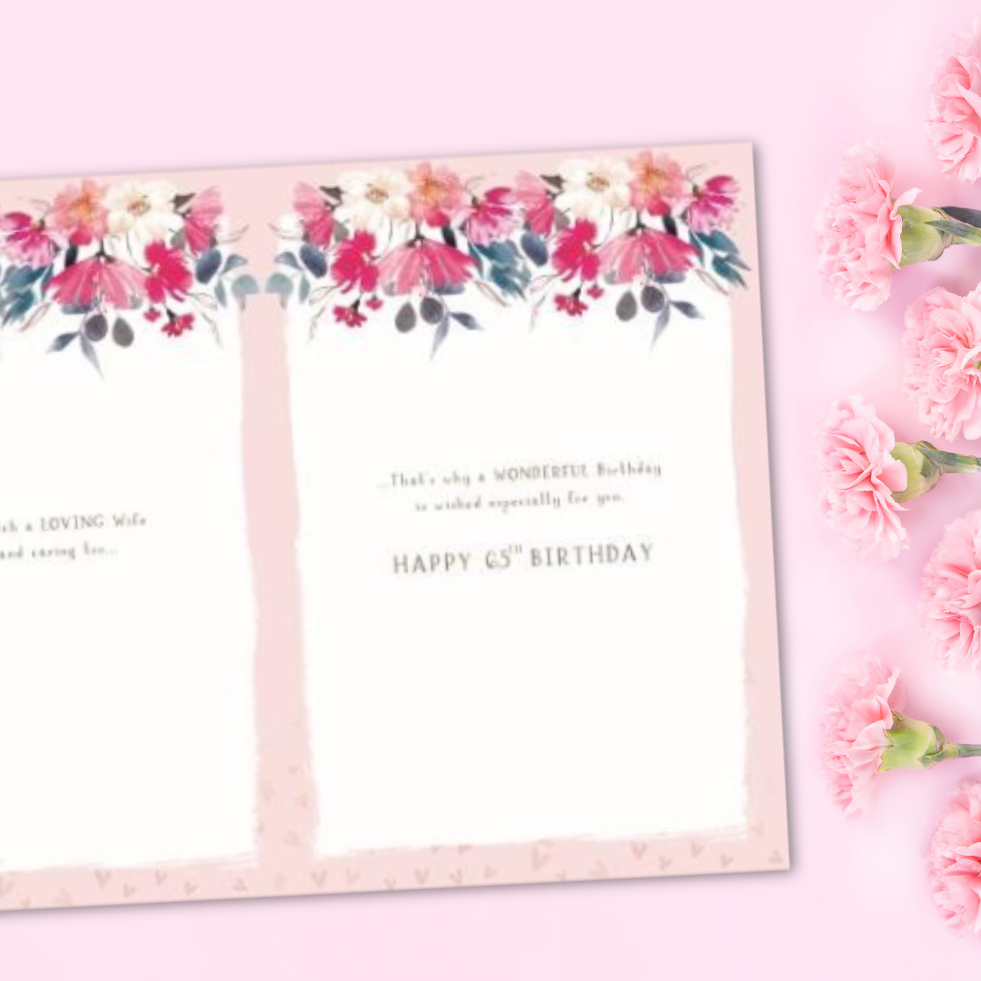 Stunning, embossed, full colour Wife 65th birthday card with rose gold foil details and colour printed insert.