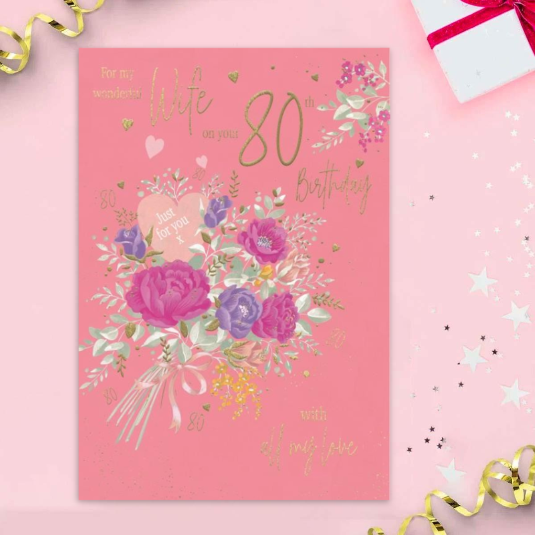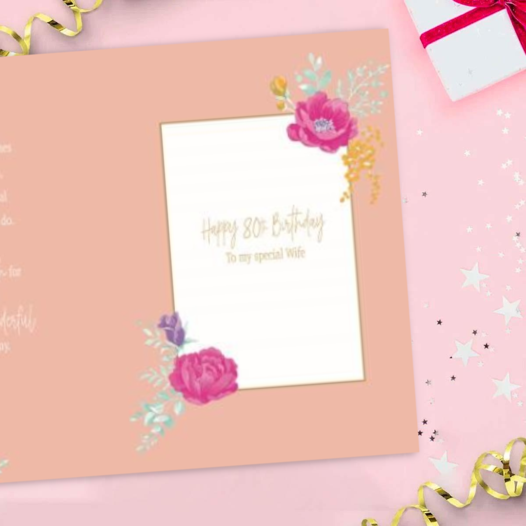Stunning full colour Wife 80th Birthday card complete with gold foil lettering and printed insert.