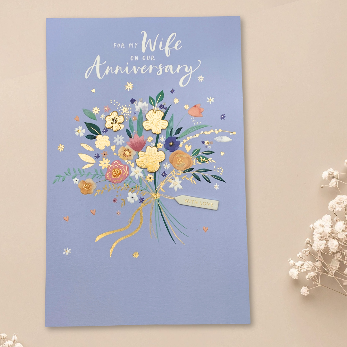 Stunning Wife Anniversary large card with decoupage elements! Finished with gold foiling details and beautiful printed insert.